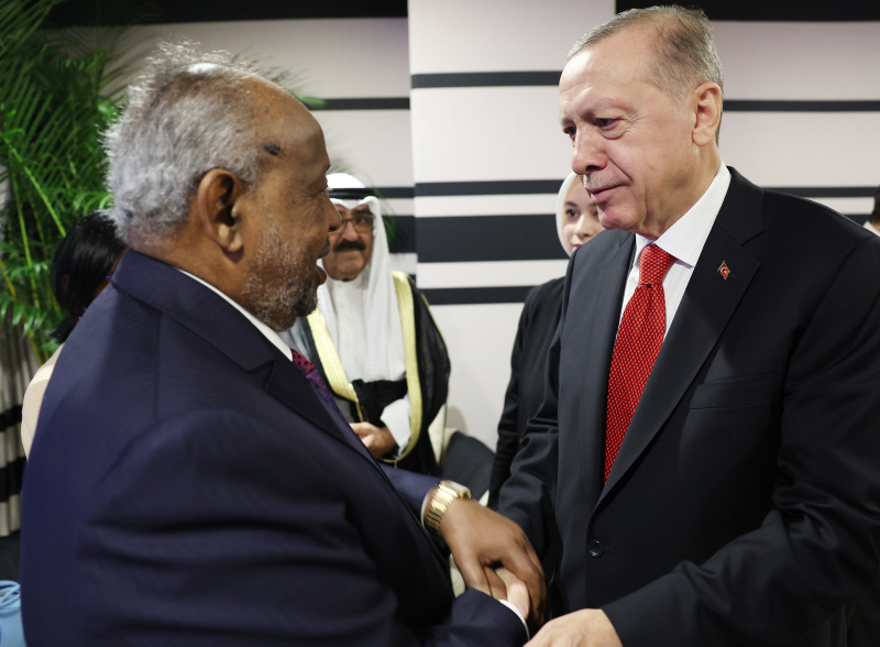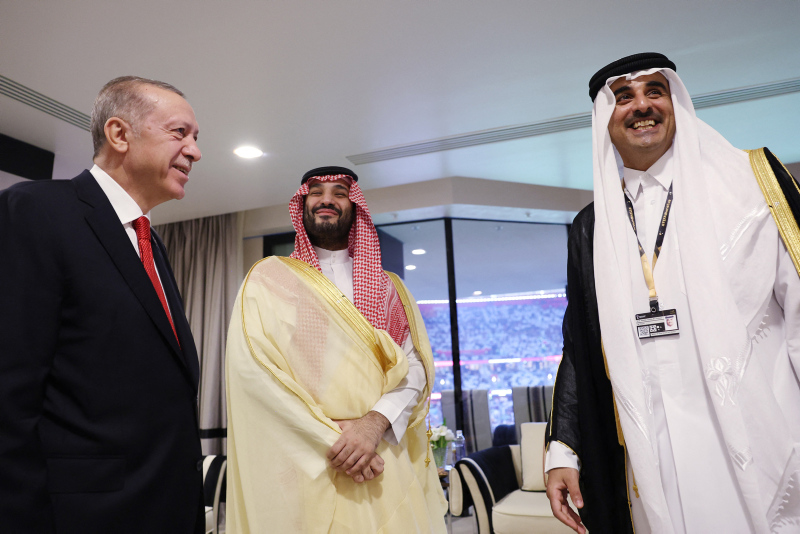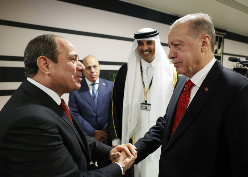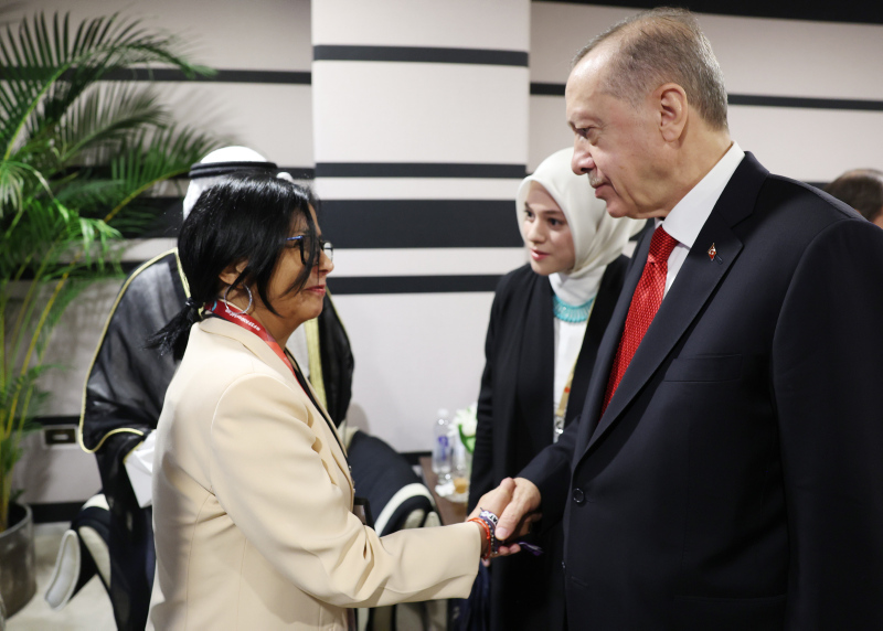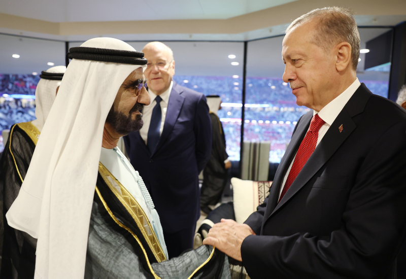 Erdoğan, Katar Emiri Şeyh Temim bin Hamed Al Sani'nin davetine icabetle geldiği Katar'ın başkenti Doha'da bulunan Al Bayt Stadı'ndaki resepsiyonda bazı liderlerle ayaküstü görüştü.