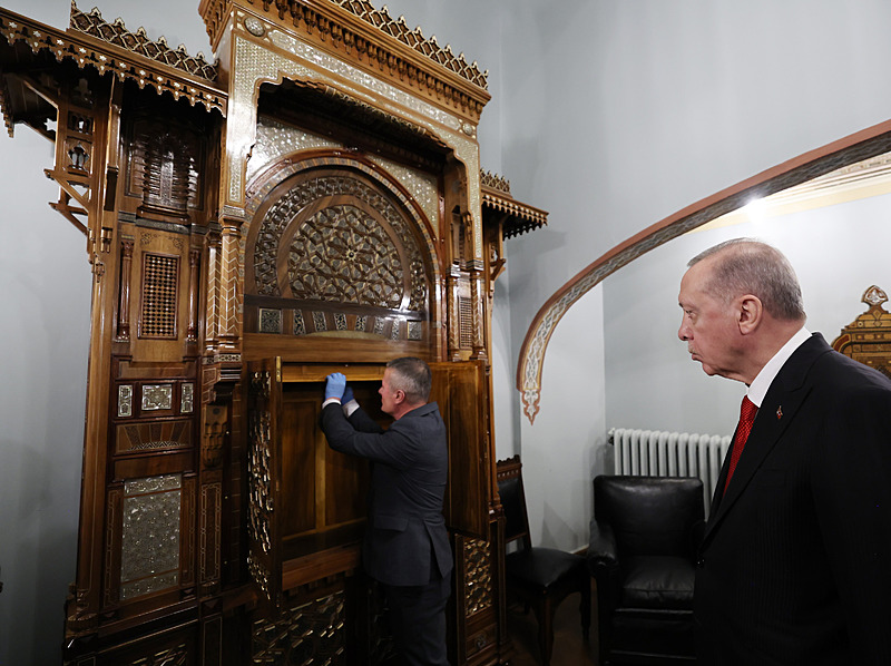 Başkan Erdoğan, Türkiye'de göreve başlayan elçilerin Atatürk'e güven mektubu sunduğu Elçilik Kabul Salonunda da incelemede bulundu. Erdoğan, burada sergilenen bir kilitli dolap hakkında bilgi aldı.