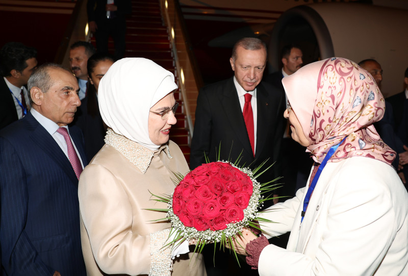 Başkan Erdoğan, Haydar Aliyev Uluslararası Havalimanı'nda Azerbaycan Başbakan Birinci Yardımcısı Yagub Eyyubov, Azerbaycan Dışişleri Bakan Yardımcısı Halef Halefov, Azerbaycan'ın Ankara Büyükelçisi Reşad Memmedov, Türkiye'nin Bakü Büyükelçisi Cahit Bağcı ve diğer yetkililer tarafından çiçekle karşılandı.