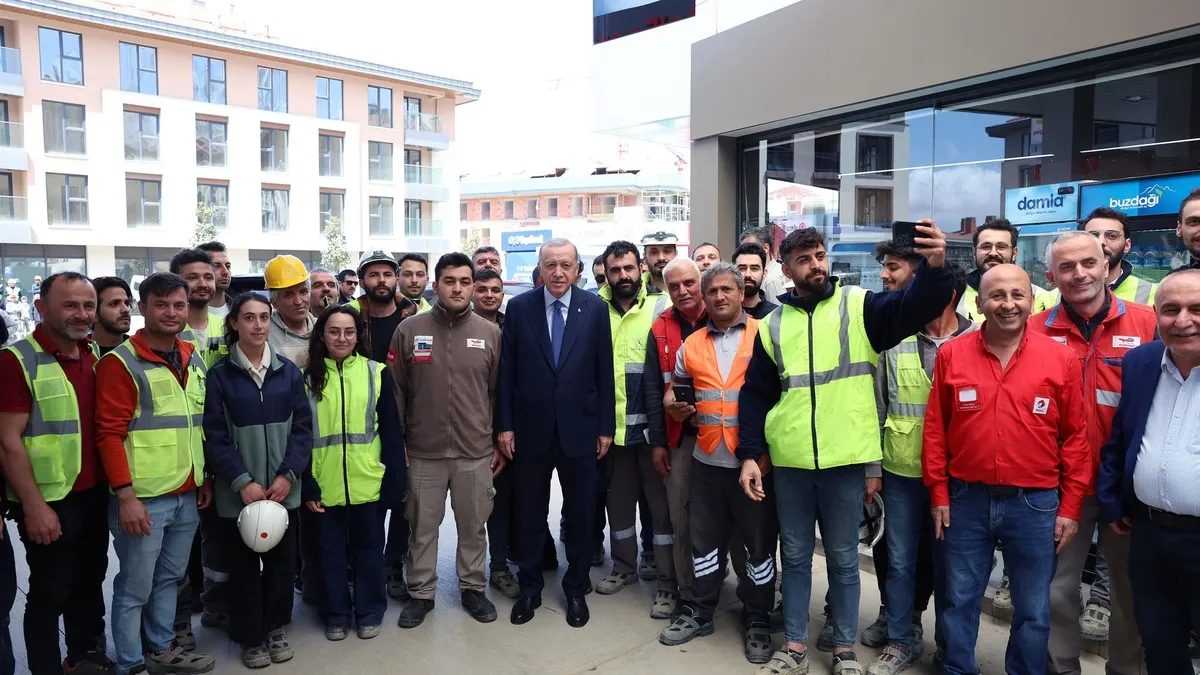Firma yöneticileri ve çalışanlarıyla sohbet eden Erdoğan, çıkışta kendisini bekleyen Kirazlıtepe Kentsel Dönüşüm Uygulama Alanı'nda görevli işçilerle fotoğraf çektirdi.