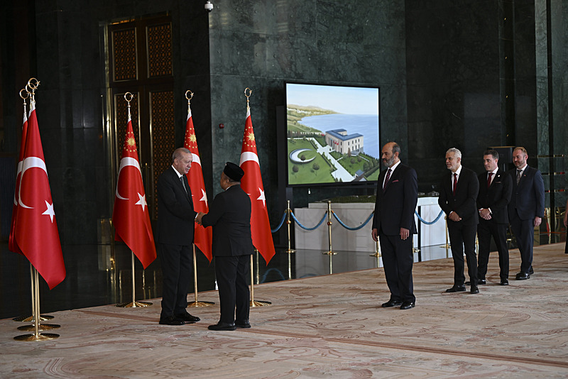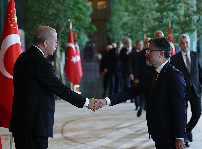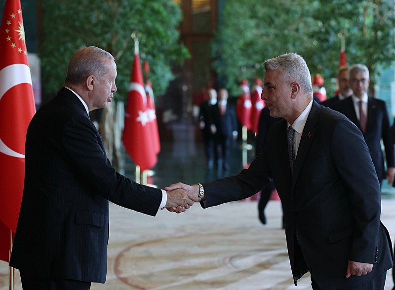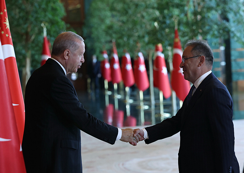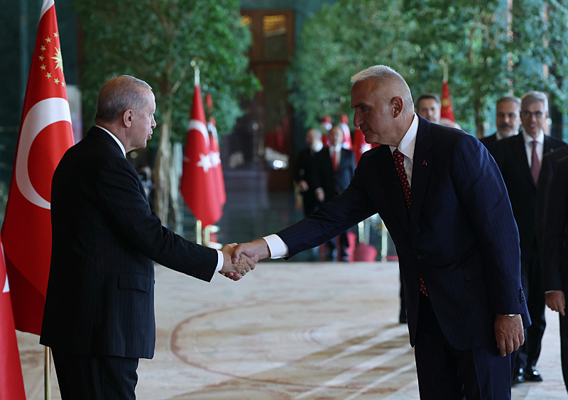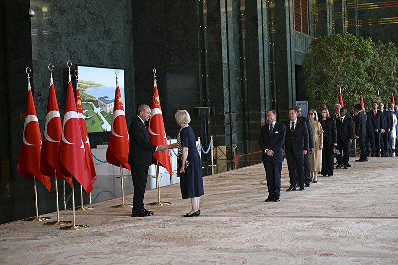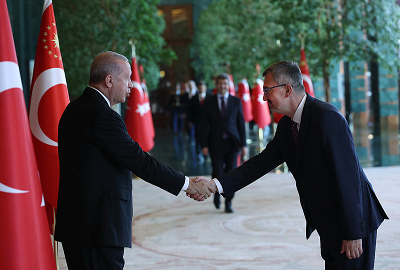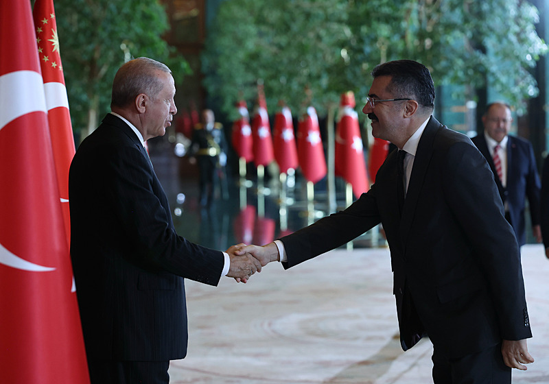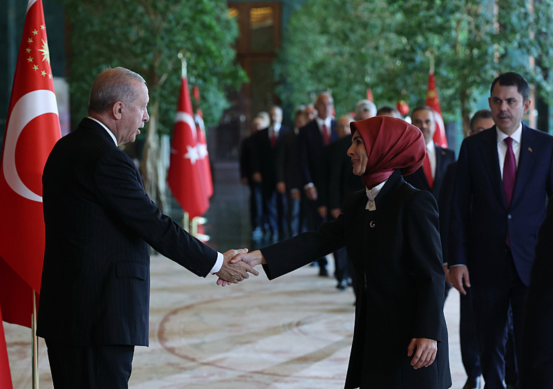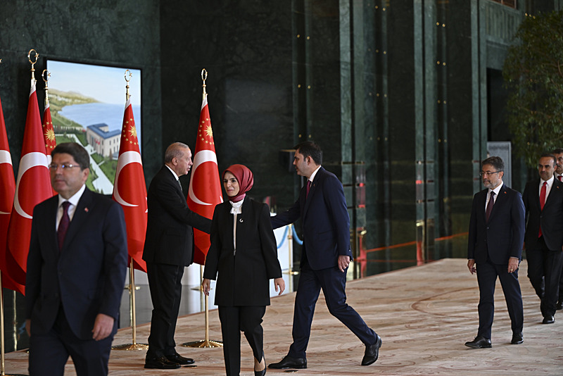 Tebrik töreninde; Cumhurbaşkanlığı Muhafız Alayı Bandosu marşlar seslendirdi. Cumhurbaşkanlığı Külliyesi ana bina girişinde düzenlenen törende; TBMM Başkanı Numan Kurtulmuş, Cumhurbaşkanı Yardımcısı Cevdet Yılmaz, AK Parti Grup Başkanı Abdullah Güler