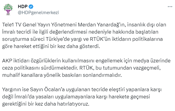 İstanbul Cumhuriyet Başsavcılığı ise Tele 1'deki açıklamaları nedeniyle Gazeteci Merdan Yanardağ hakkında soruşturma başlattı. İstanbul Cumhuriyet Başsavcılığı dün bir televizyon programında gazeteci Merdan Yanardağ'ın bölücü terör örgütü elebaşı Abdullah Öcalan hakkında açıklamaları nedeniyle "Suçu ve Suçluyu Övme" ve "Terör Örgütü Propagandası Yapmak" suçlarından resen soruşturma başlattı.