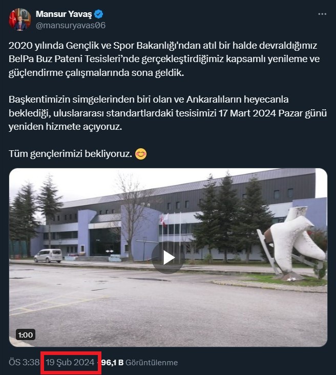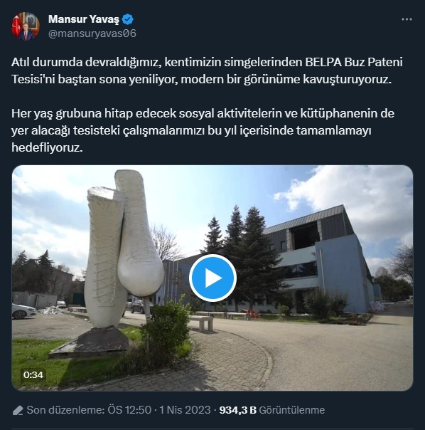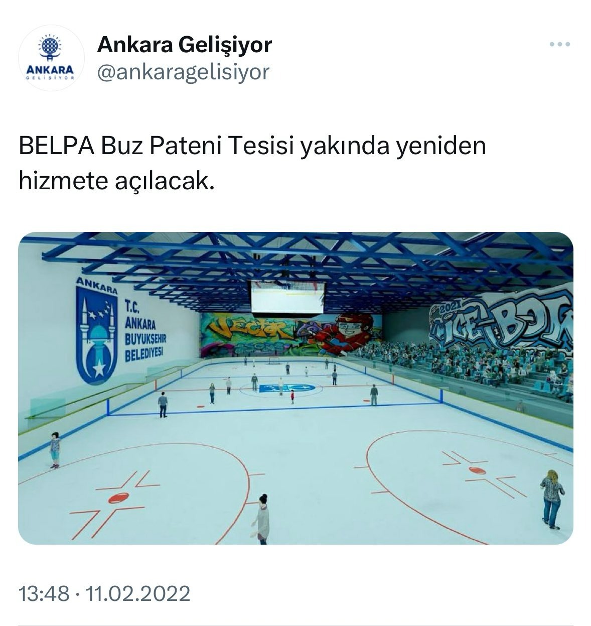Ankara Büyükşehir Belediye Başkanı Mansur Yavaş, Türkiye'nin buz sporlarında ilk olimpik tesisi olan ve yüzlerce müsabakaya ev sahipliği yapan olimpik BELPA Buz Pateni Spor Salonu'nu "atıl" bir şekilde aldıklarını sosyal medya hesabından yayınladığı bir videoyla paylaşmıştı.