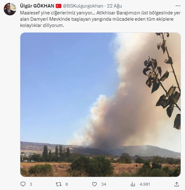 Atıkhisar Barajımızın üst bölgesinde yer alan Damyeri Mevkii'nde başlayan yangında mücadele eden tüm ekiplere kolaylıklar dilerim" yazdı.