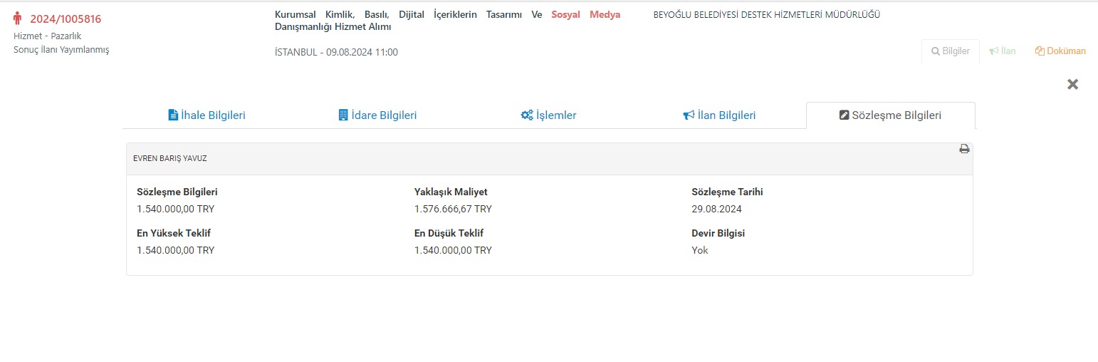 CHP'li Beyoğlu Belediyesi'nin terör örgütü propagandası suçundan yargılanan Evren Barış Yavuz'a ihale verdiği ortaya çıktı. "Sosyal Medya Danışmanlığı Hizmet Alımı" başlığıyla Ağustos ayında düzenlenen ihalenin 1 milyon 540 bin Türk lirası bedeli olduğu öğrenildi.