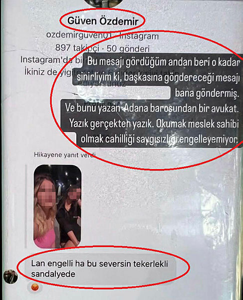 CHP Adana İl yönetiminde başkan yardımcısı olan avukat Güven Özdemir'in, engelli kadın meslektaşına yönelik çirkin tacizi 'tesadüfen' ifşa oldu. Özdemir, tekerlekli sandalyedeki genç avukatın sosyal medyada paylaştığı fotoğrafla ilgili yazdığı "Lan engelli ha bu, seversin tekerlekli sandalyede" şeklindeki çirkin mesajı yanlışlıkla genç kızın kendisine gönderdi.