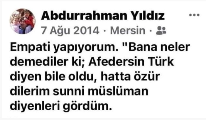 Kendisine Türk denilmesinden hoşlanmadığını ve üzüntü duyduğunu söyleyen Yıldız'ın paylaşımında "Empati yapıyorum. Bana neler demediler ki. Affedersiniz Türk diyen bile oldu. Hatta özür dilerim Sünni Müslüman diyenleri gördüm" ifadelerini kullandığı gözlendi.