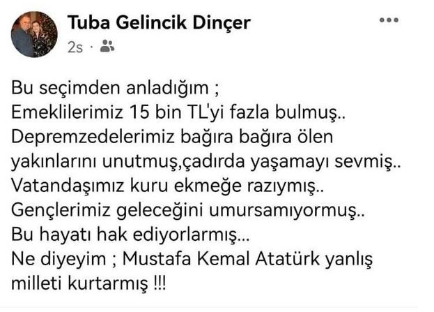 Dinçer, "Bu seçimden anladığım; emeklilerimiz 15 bin TL'yi fazla bulmuş, depremzedelerimiz bağıra bağıra ölen yakınlarını unutmuş, çadırda yaşamayı sevmiş. Vatandaşımız kuru ekmeğe razıymış. Gençlerimiz geleceğini umursamıyormuş. Bu hayatı hak ediyorlarmış. Ne diyeyim Mustafa Kemal Atatürk, yanlış milleti kurtarmış" dedi. Dinçer skandal paylaşımını ise gelen tepkilerin ardından geri çekti.