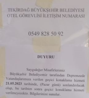 CHP'li Tekirdağ Büyükşehir Belediyesi'nin Kumbağ'da kalan depremzedelere yönelik tahliye kararı otellere asıldı.
