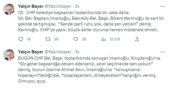 Toplantıda yaşanan tartışmaları sosyal medya hesabından paylaşan Gazeteci Yazar Yalçın Bayer, İmamoğlu ile Kılıçdaroğlu'nun karşı karşıya geldiğini aktardı.