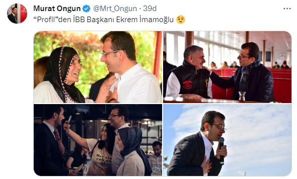 CHP İstanbul İl Başkanı Canan Kaftancıoğlu'nun "Kemal Kılıçdaroğlu Genel Başkan olmasaydı çok büyük ihtimalle Ekrem İmamoğlu profilinde birisi İstanbul Büyükşehir Belediye Başkan Adayı olamazdı." sözlerine Murat Ongun'dan yanıt geldi. Ongun, sosyal medya hesabından İmamoğlu'nun 4 fotoğrafını paylaşarak "'Profil'den İBB Başkanı Ekrem İmamoğlu" yorumunu yaparak Kaftancıoğlu'na göndermede bulundu.