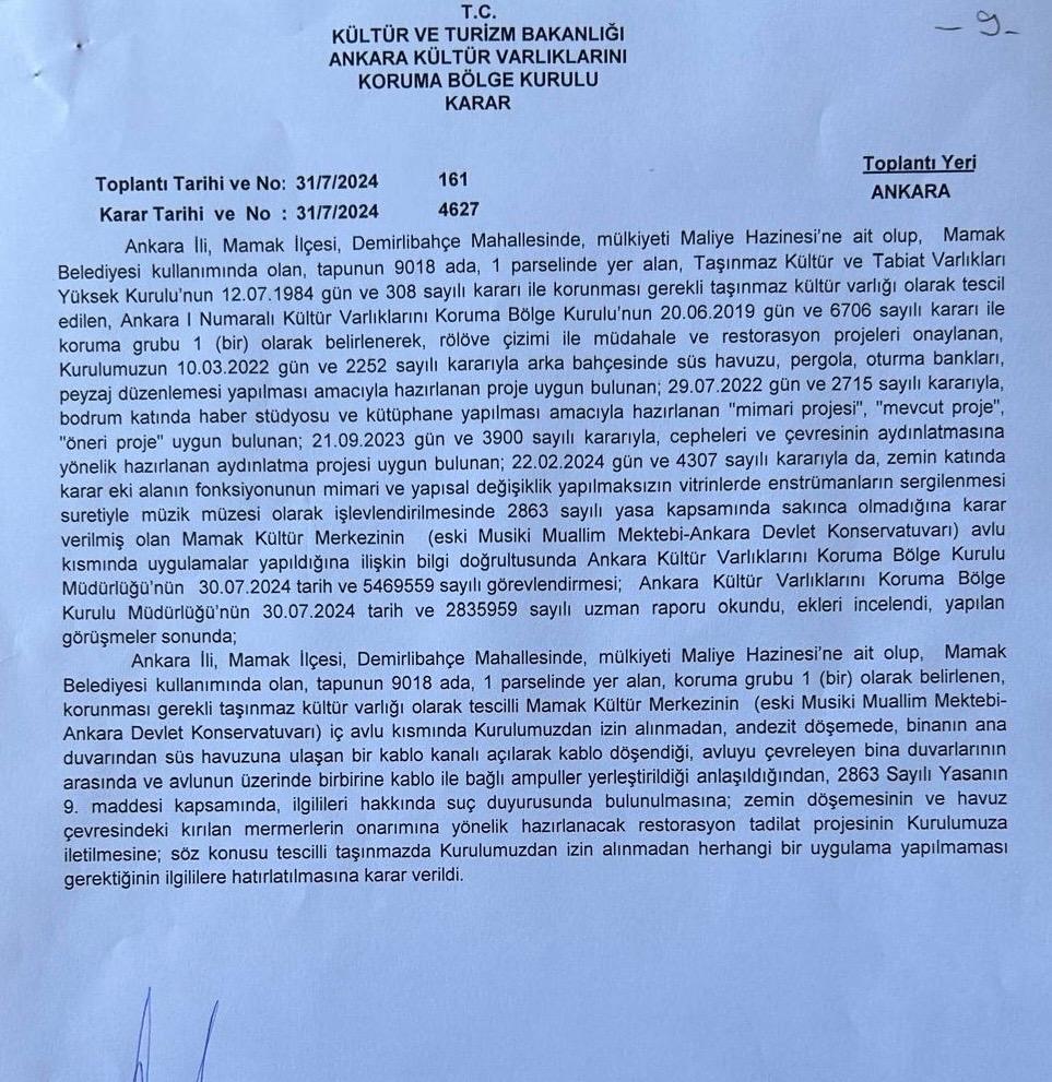 Tarihi binada yapılan uygunsuz tadilat işlemleri ile ilgili Kültür ve Turizm Bakanlığı Ankara Kültür Varlıklarını Koruma Bölge Kurulu'ndan tarihi yapının eski haline dönüştürülmesi ve sorumlular hakkında suç duyurusunda bulunulması kararı çıktı. Söz Konusu karar metninde şu ifadeler yer aldı;
