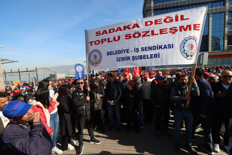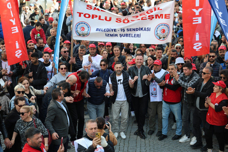 İzmir'de Belediye İş Sendikası üyesi 6 bin işçi Toplu İş Sözleşmesi görüşmelerinden olumlu sonuç alınmadığı gerekçesiyle iş bıraktı. "Sadaka Değil Toplu Sözleşme" yazılı pankart açarak İzmir Büyükşehir Belediye Başkanlığı önüne yürüyen işçiler, Tunç Soyer'in ofisinin önünde oturma eylemi yaptı. Belediye İş Sendikası 2 No'lu Şube Başkanı Savaş Atalay, "Belediye yönetimi sesimizi duymuyor, yaşadığımız yoksulluğu, geçim sıkıntısını görmüyor" ifadelerini kullandı.