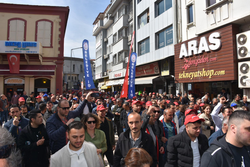 Ardından belediye binasına yürüyüşe geçti. Müzikler ve türküler eşliğinde halaylar çeken kalabalık, 'sadaka değil toplu sözleşme', 'direne direne kazanacağız', 'hak, hukuk adalet', 'zafer emekçinin olacak' sloganları atarak belediye önüne gitti.