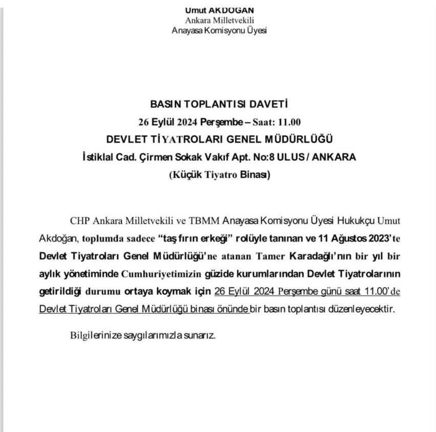 Devlet Tiyatroları Genel Müdürü Tamer Karadağlı'yı eleştirmek için CHP Ankara Milletvekili Umut Akdoğan tarafından kurum önünde toplanma çağrısı yapıldı. Basın toplantısı daveti, Karadağlı'ya tepki gösteren Devlet Tiyatrosu oyuncuları, STK üyeleri ve CHP'liler tarafından paylaşıldı. CHP'li vekil Akdoğan bugün söylediği gibi basın toplantısı düzenlemek için Devlet Tiyatroları Genel Müdürlüğü önüne geldi. Ancak büyük bir şok yaşadı. Bir kişi bile toplantıya katılım göstermedi.