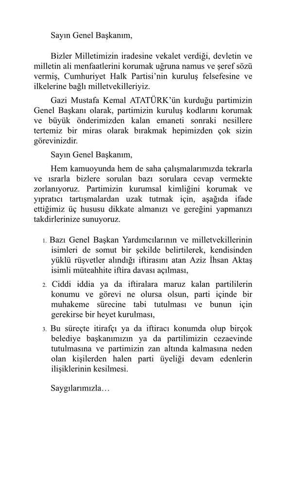 CHP'de yolsuzluk soruşturmalarına ilişkin iddianamelerin yayımlanmasıyla beraber milletvekilleri yaşadıkları sıkıntılara dair mektup yazarak Genel Başkan Özgür Özel'e yolladı. Atatürk'ün mirası ve partinin kuruluş ilkelerine bağlılık vurgulanan metinde, kamuoyunda ve sahada tekrarlanan sorulara yanıt vermekte zorlanıldığı belirtildi ve partinin kurumsal kimliğinin yıpranmaması için somut adımlar atılması istendi.