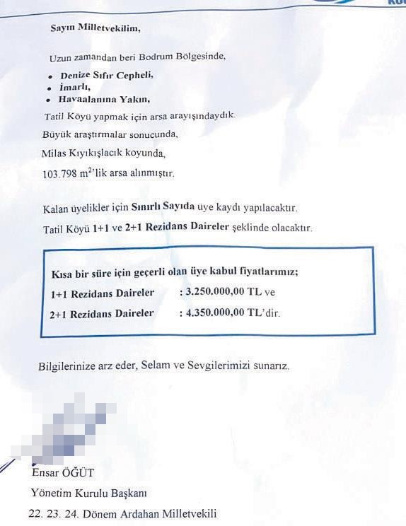 Öğüt'ün milletvekillerine gönderdiği ve basına sızan mektupta ise rezidansların 1+1 ve 2+1 şeklinde projelendirildiği görüldü. 1+1 daireler 3 milyon 250 bin liradan, 2+1 dairelerin ise 4 milyon 350 bin liradan satışa sunuldu. Öğüt'ün vekillere ıslak imza ile gönderdiği mektupta, "Sayın milletvekilim, uzun zamandan beri Bodrum bölgesinde denize sıfır cepheli, imarlı, havaalanına yakın tatil köyü yapmak için arsa arayışındaydık. Büyük araştırmalar sonucunda Milas Kıyıkışlacık Koyu'nda 103 bin 798 metrekarelik arsa alınmıştır. Kalan üyelikler için sınırlı sayıda üye kaydı yapılacaktır" denildi.