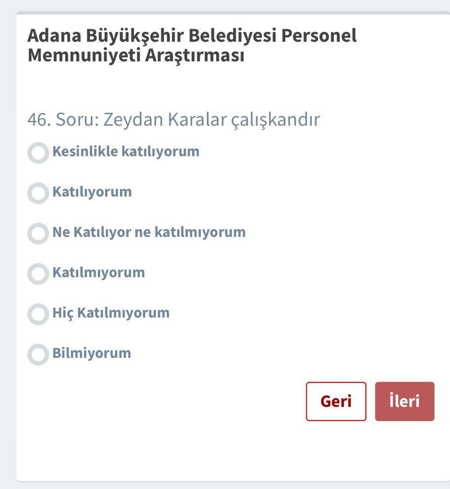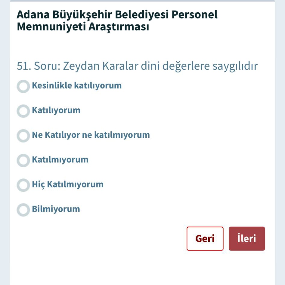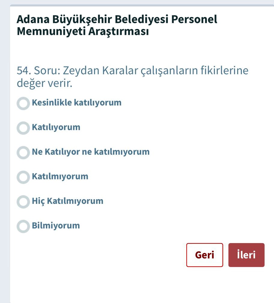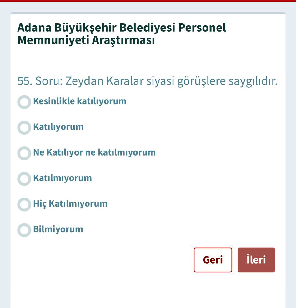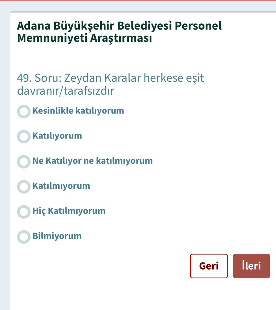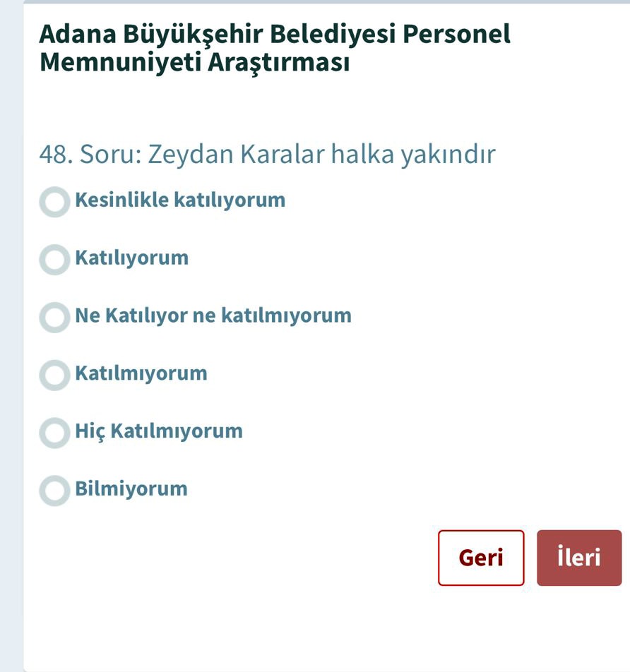 Karalar, 'personel memnuniyeti araştırması' adı altında belediye çalışanlarına "Zeydan Karalar, siyasi görüşlere saygılıdır", "Zeydan Karalar, herkese eşit davranır/tarafsız" tarzında soruların bulunduğu anketi yolladı.