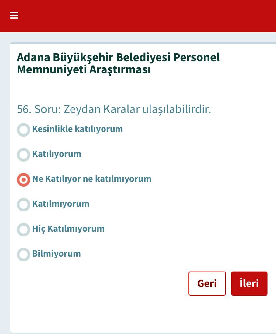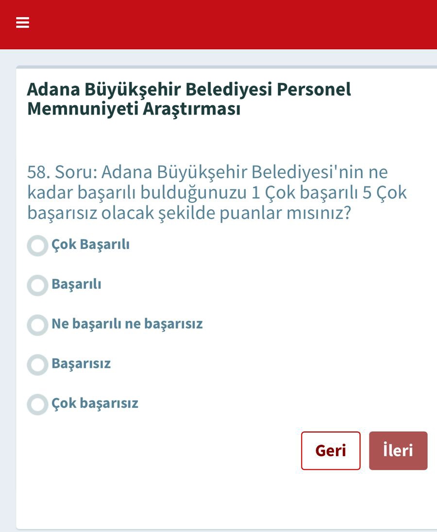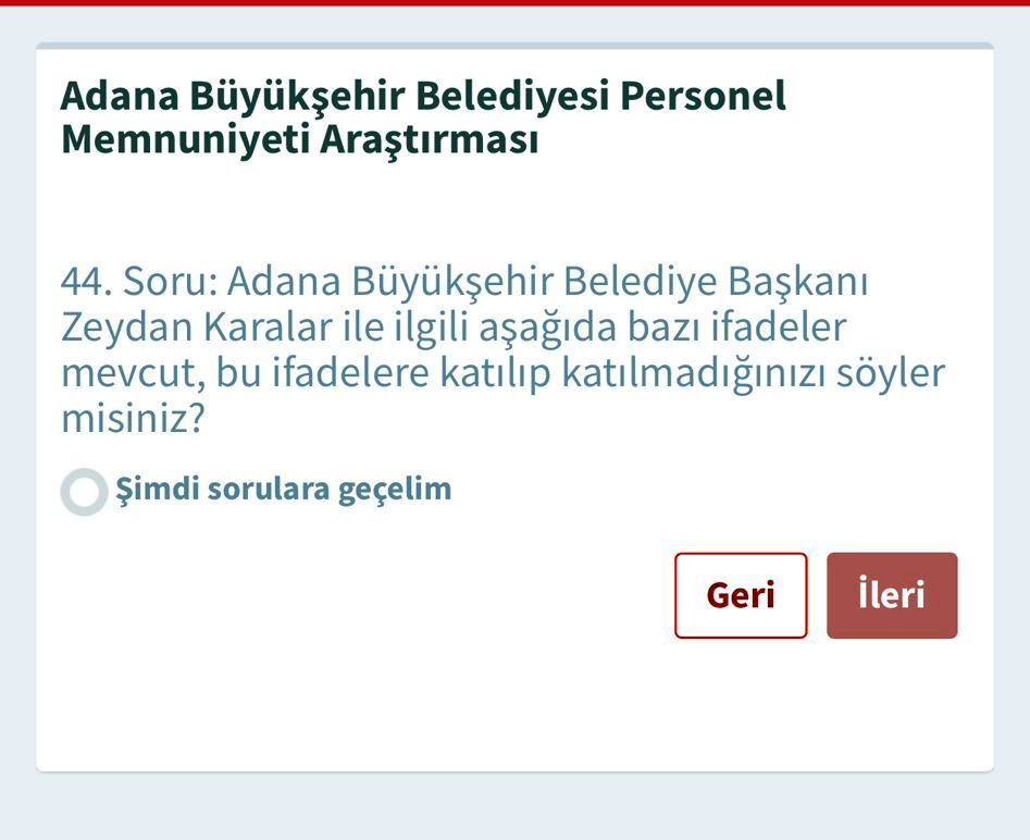 CHP'li Adana Büyükşehir Belediyesi Zeydan Karalar da, kurum içinde kendisine yönelik 'memnuniyet anketi' yaptı.