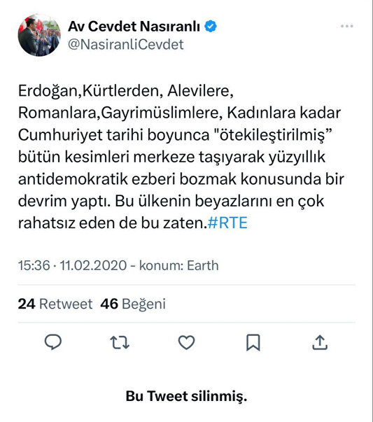 "Erdoğan, Kürtlerden, Alevilere, Romanlara, Gayrimüslimlere, Kadınlara kadar Cumhuriye tarihi boyunca, ötekileştirilmiş bütün kesimleri merkeze taşıyarak yüz yıllık antidemokratik ezberi bozmak konusunda bir devrim yaptı."