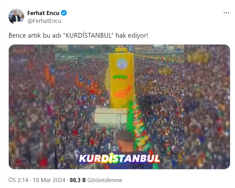CHP'nin ortağı DEM Partili Ferhat Encü, pazar günü yapılan DEM Parti İstanbul İl Başkanlığı tarafından Yenikapı Etkinlik Alanı'nda nevruz kutlamaları görüntülerini yayınladı. Terör örgütü paçavralarının sallandığı ve teröristbaşı Öcalan sloganlarının atıldığı görüntülerle birlikte küstah ifadeler kullandı.