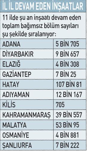 Dünyanın en büyük inşaat sahası konumundaki deprem bölgesinde asrın seferberliği gecegündüz devam ediyor. Ocak ayı itibarıyla ihalesi yapılmayan tek bir konut bile bırakmayan devlet, hâlihazırda 251 bin 403 bağımsız bölümün inşaatını aynı anda yürütüyor