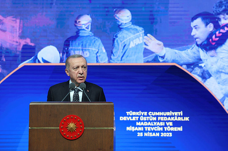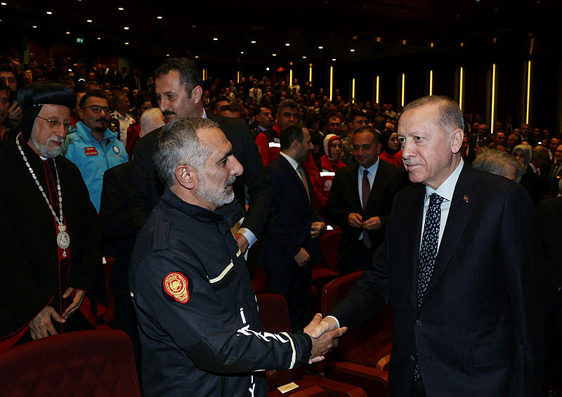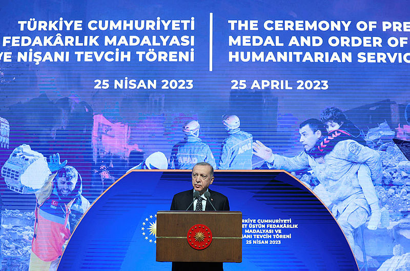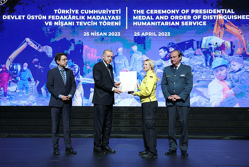 Deprem sonrası çalışmalarda sembolleşen isimler, kurumlar ile ekiplerin yerli ve yabancı temsilcilerine Devlet Üstün Fedakarlık Madalyası ve Nişanı takdim ederek, deprem bölgesindeki çabaları dolayısıyla şükranlarını sunduğunu belirten Erdoğan, madalya ve nişan alanlarla birlikte arama kurtarma ekiplerine, madencilere, itfaiyecilere, belediyelere, kamu görevlilerine, sivil toplum kuruluşlarına, gönüllülere, yardım çağrısına destek veren tüm yabancılara teşekkür etti.