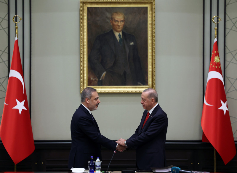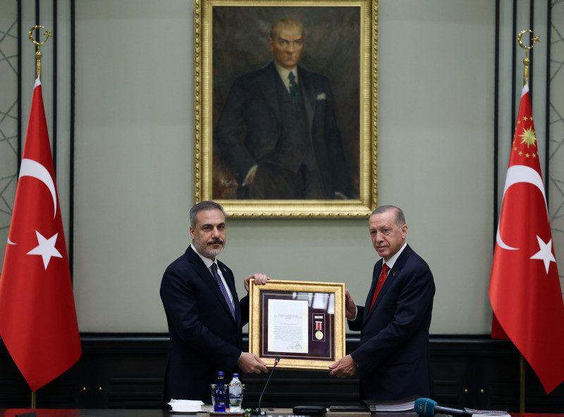Başkan Erdoğan, Milli İstihbarat Teşkilatı'nda 13 yıl boyunca müsteşar yardımcısı, müsteşar ve başkanlık ile Cumhurbaşkanı özel temsilcisi olarak görev yapan Dışişleri Bakanı Hakan Fidan'a 'Devlet Üstün Hizmet Madalyası Beratı' verdi.