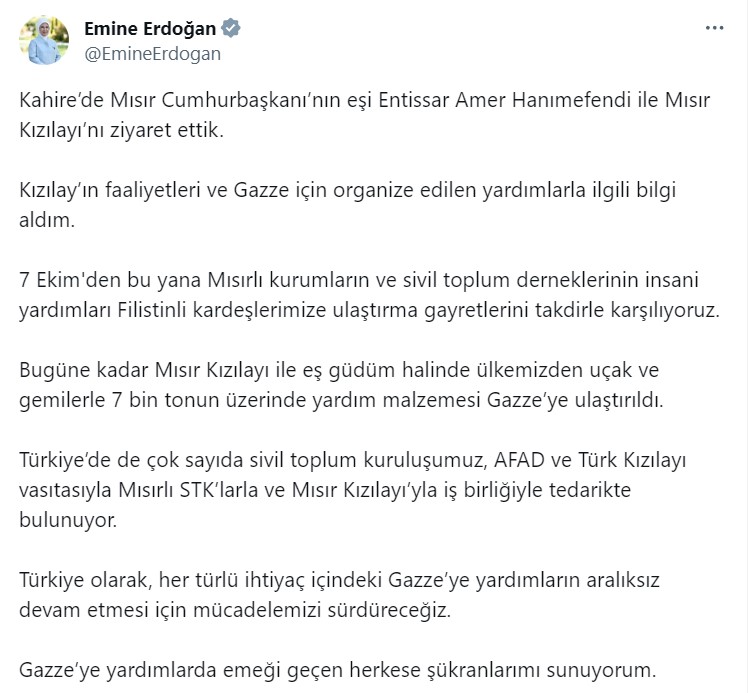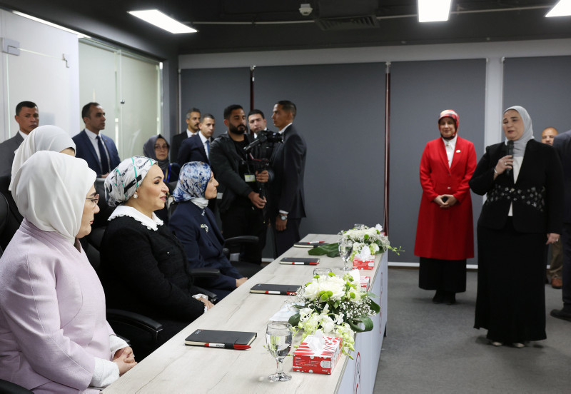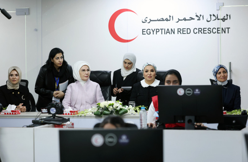 Cumhurbaşkanı Recep Tayyip Erdoğan'ın eşi Emine Erdoğan, Mısır Cumhurbaşkanı Abdulfettah es-Sisi'nin eşi Entissar Amer ile bir araya geldi. Basına kapalı olarak gerçekleşen görüşmede, Gazze'de yaşanan insanlık trajedisinden etkilenen yetim çocuklara yönelik atılması planlanan değerlendirildi. Görüşmenin ardından Mısır Kızılayı'nı ziyaret eden Emine Erdoğan ile Entissar Amer, Gazze'ye gönderilecek yardım paketlerinin üzerine "Sizi çok seviyoruz" mesajı yazması dikkat çekti.