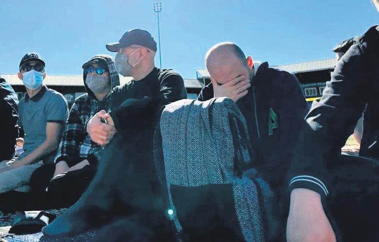 Yüzlerini güneş gözlükleri ve şapkalarla gizleyen FETÖ'cüler de açık havada oldukları hâlde pandemide ele ayağa düşen cerrahi maskelerden takmışlardı.