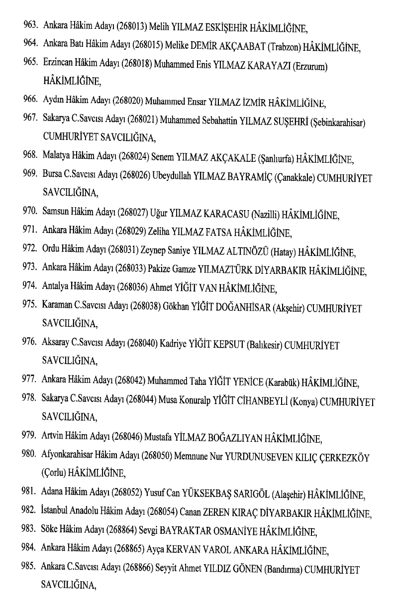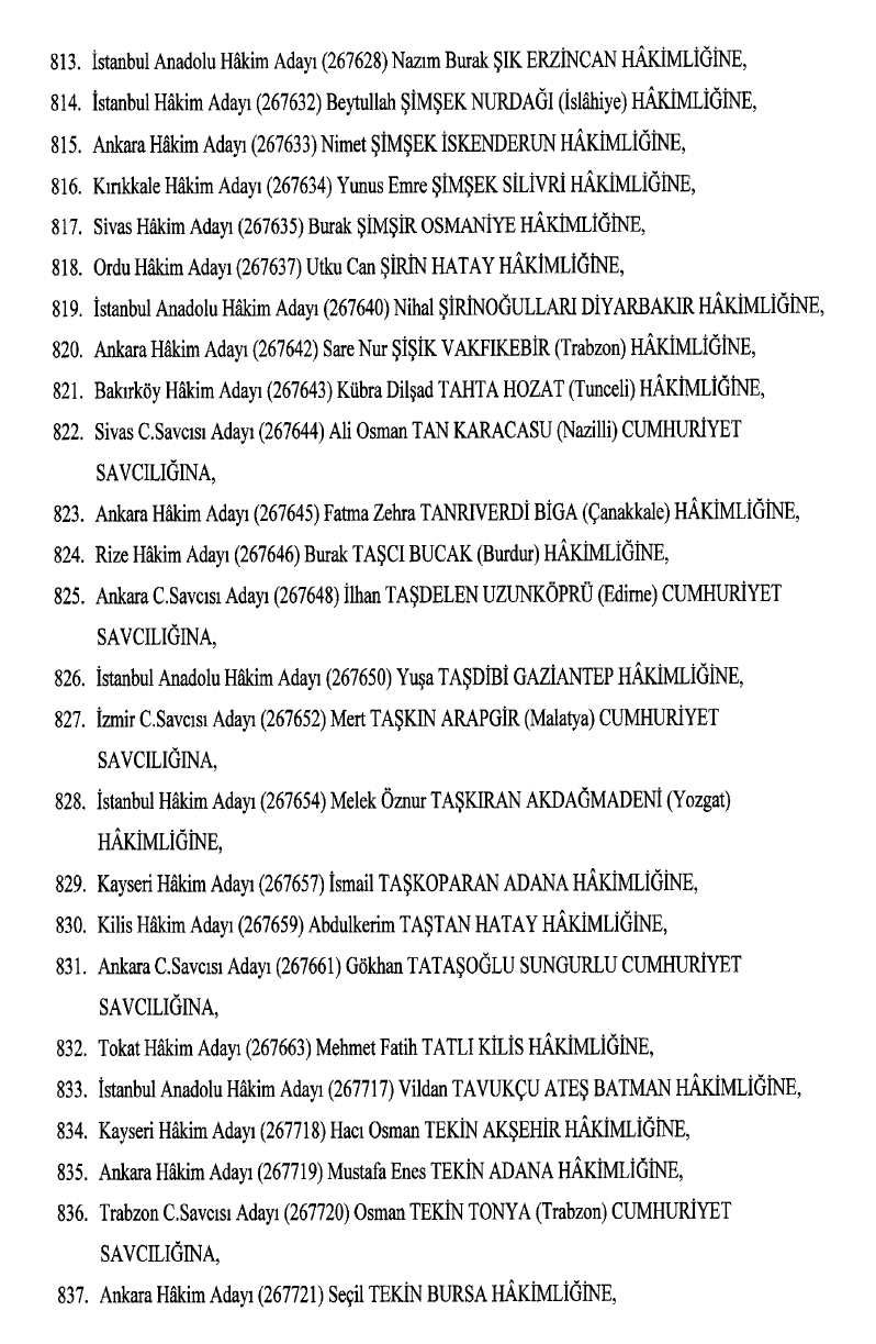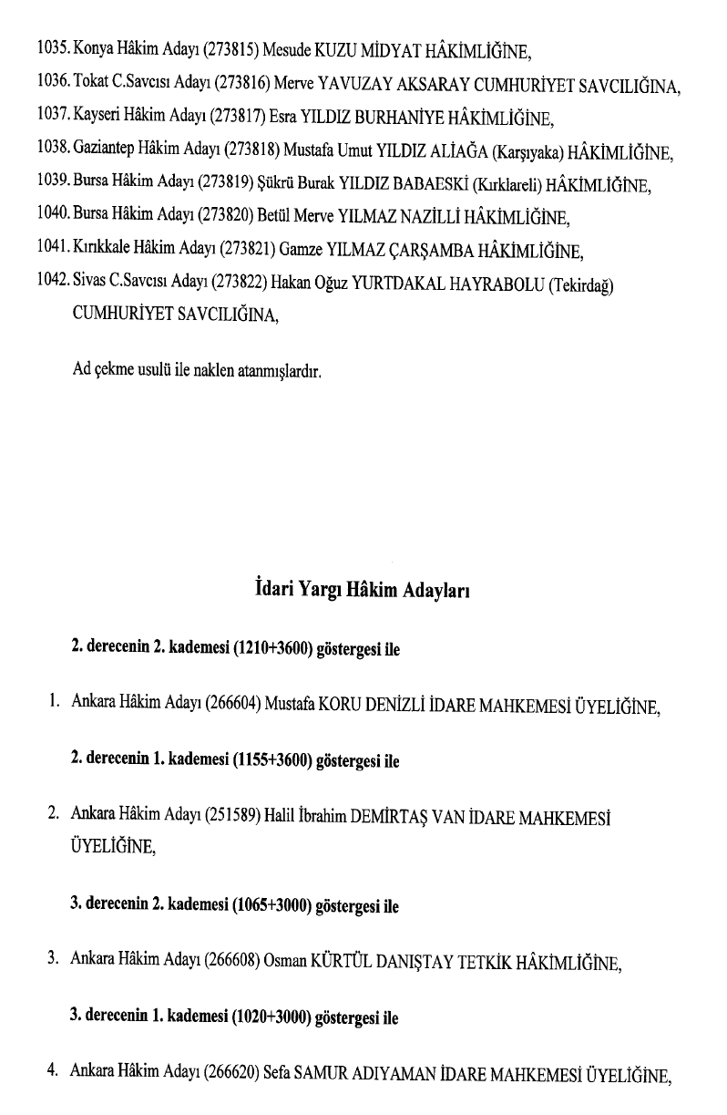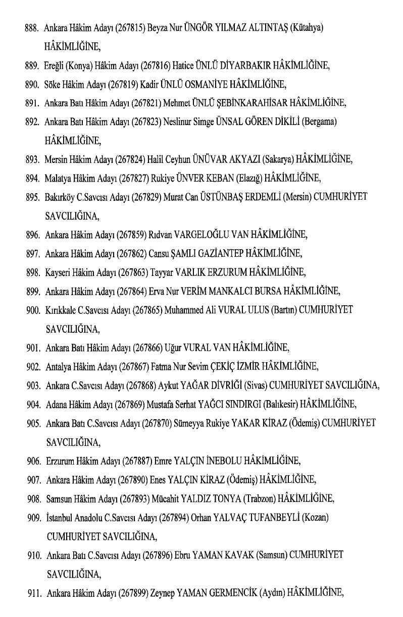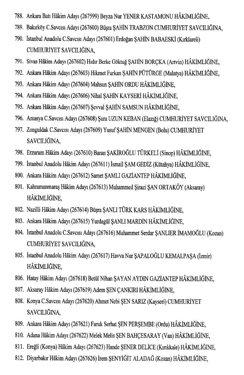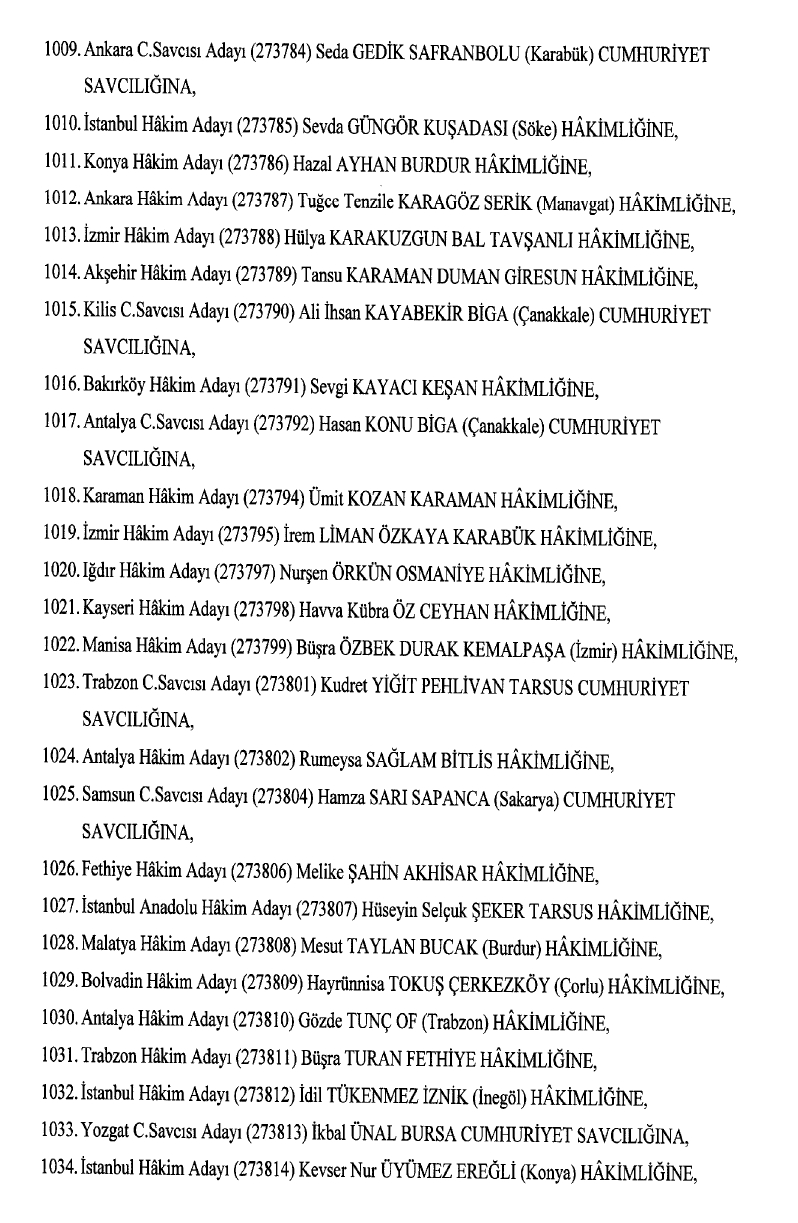Hakimler ve Savcılar Kurulunca (HSK), 1042 adli yargı hakim ve Cumhuriyet savcısı adayı ile 60 idari yargı hakim adayının atama kararı, Resmi Gazete'de yayımlandı. Buna göre, 1042 adli yargı hakim ve Cumhuriyet savcısı adayı ile 60 idari yargı hakim adayı, 25 Temmuz'da yapılan ad çekme sonucu HSK tarafından atandı. Söz konusu atamalar, 2802 sayılı Hakimler ve Savcılar Kanunu'nun 13. maddesi gereğince gerçekleştirildi. İşte isim isim o liste...