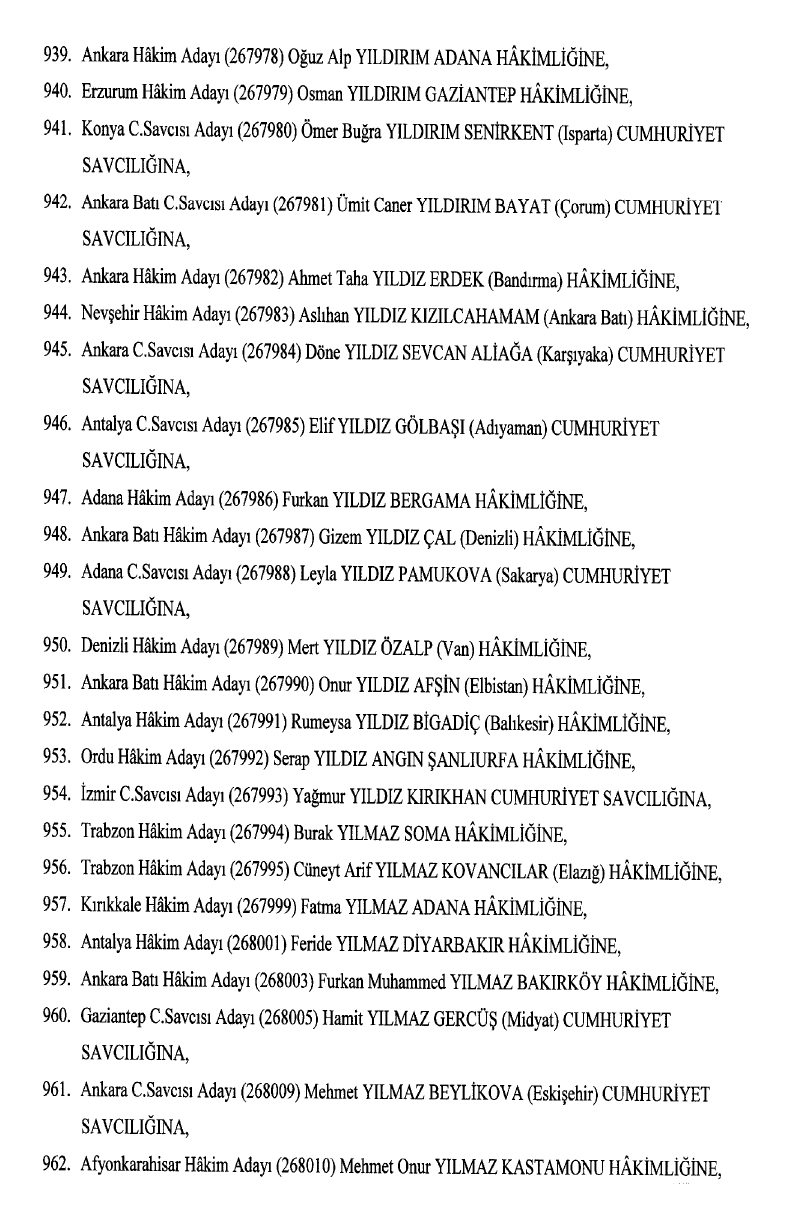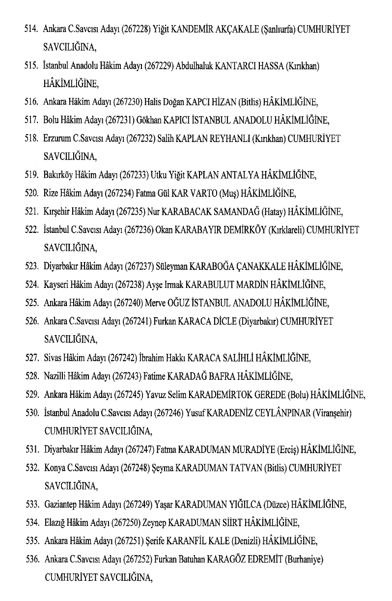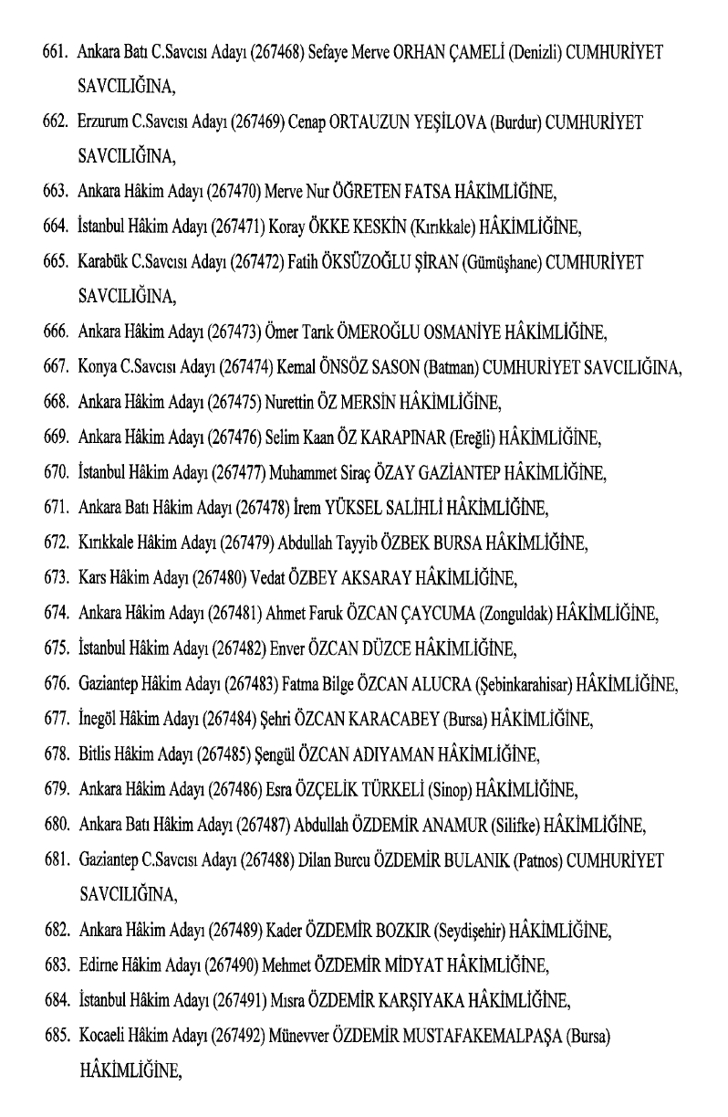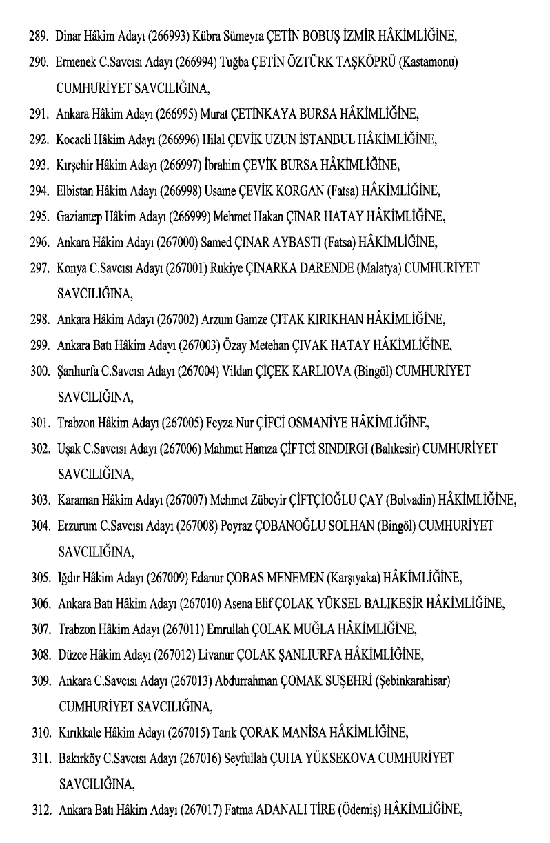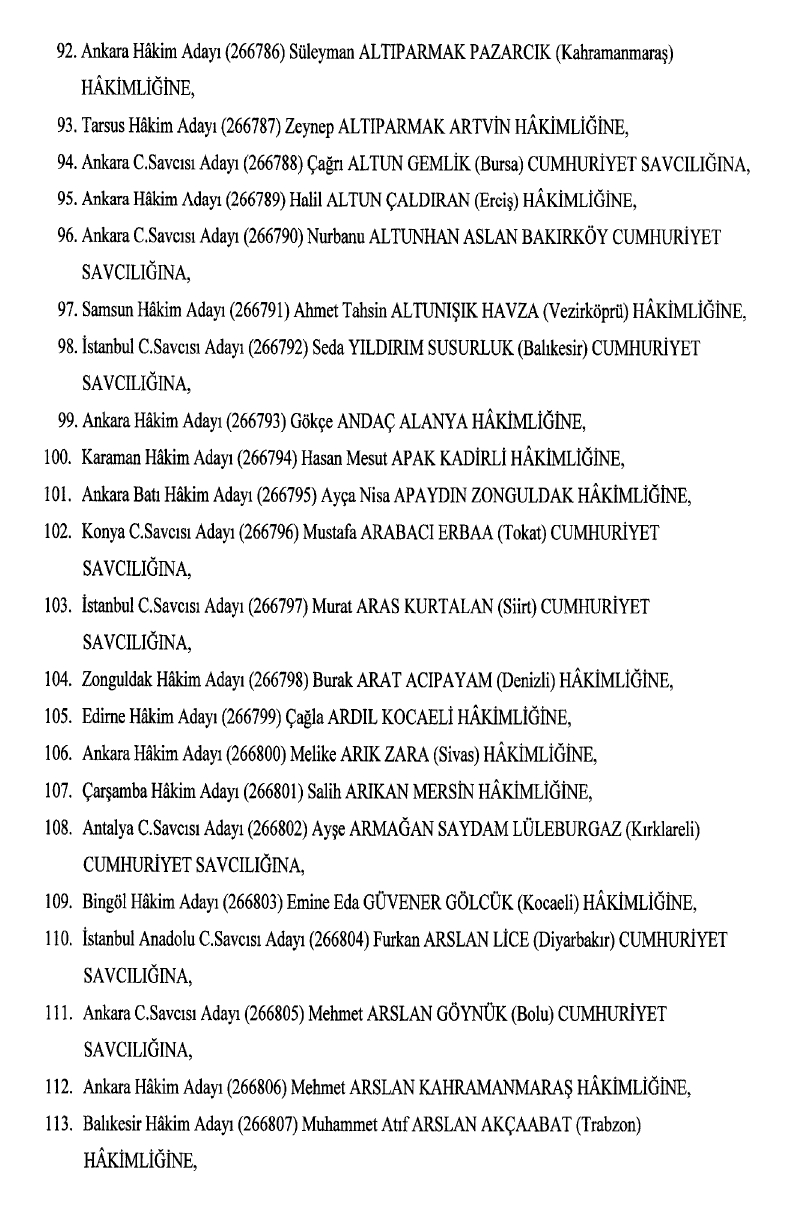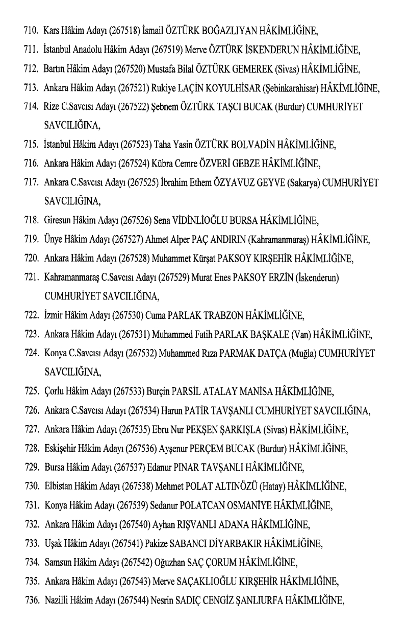 Hakimler ve Savcılar Kurulunca (HSK), 1042 adli yargı hakim ve Cumhuriyet savcısı adayı ile 60 idari yargı hakim adayının atama kararı, Resmi Gazete'de yayımlandı. Buna göre, 1042 adli yargı hakim ve Cumhuriyet savcısı adayı ile 60 idari yargı hakim adayı, 25 Temmuz'da yapılan ad çekme sonucu HSK tarafından atandı. Söz konusu atamalar, 2802 sayılı Hakimler ve Savcılar Kanunu'nun 13. maddesi gereğince gerçekleştirildi. İşte isim isim o liste...