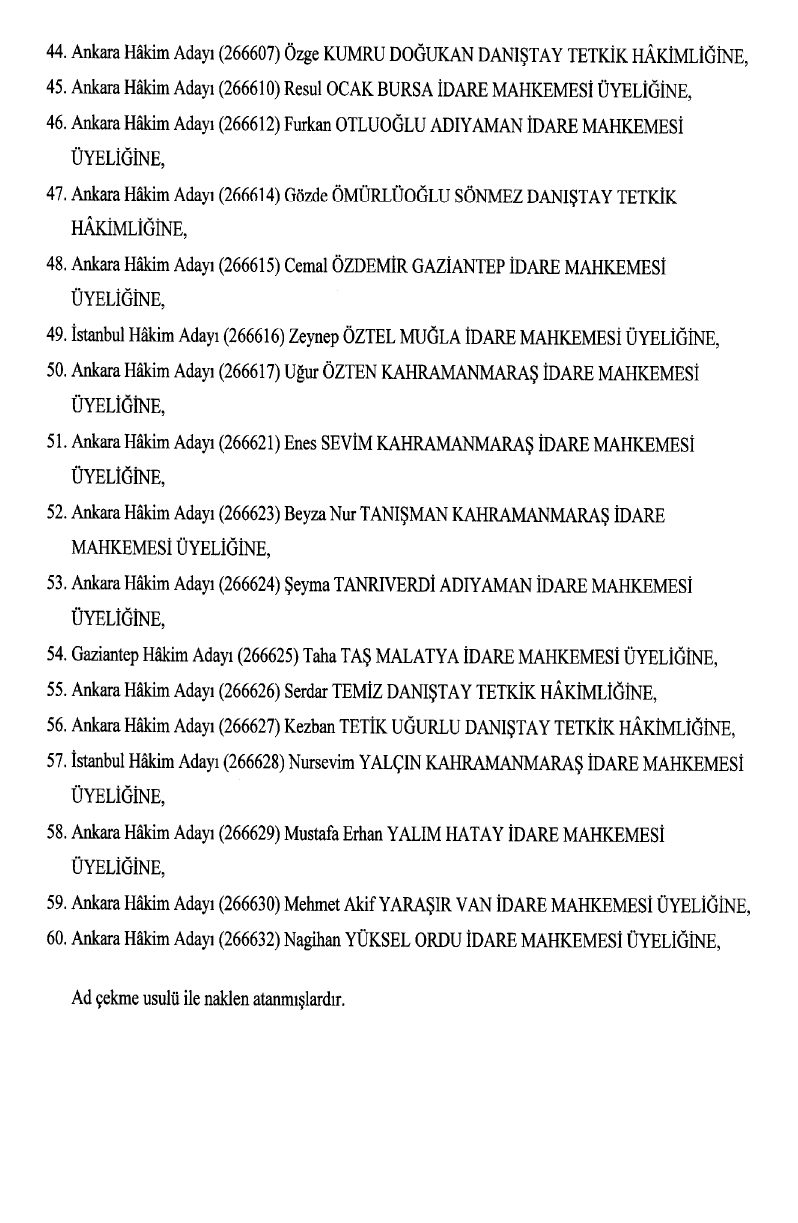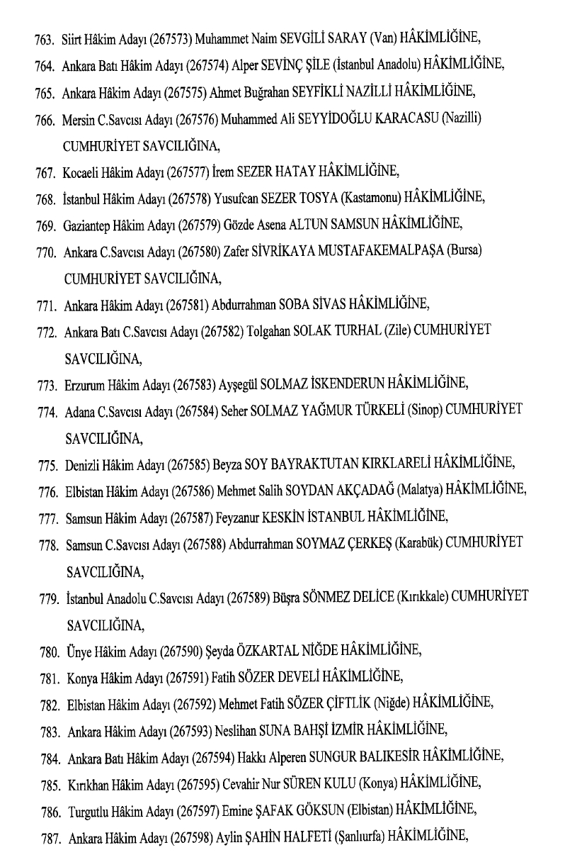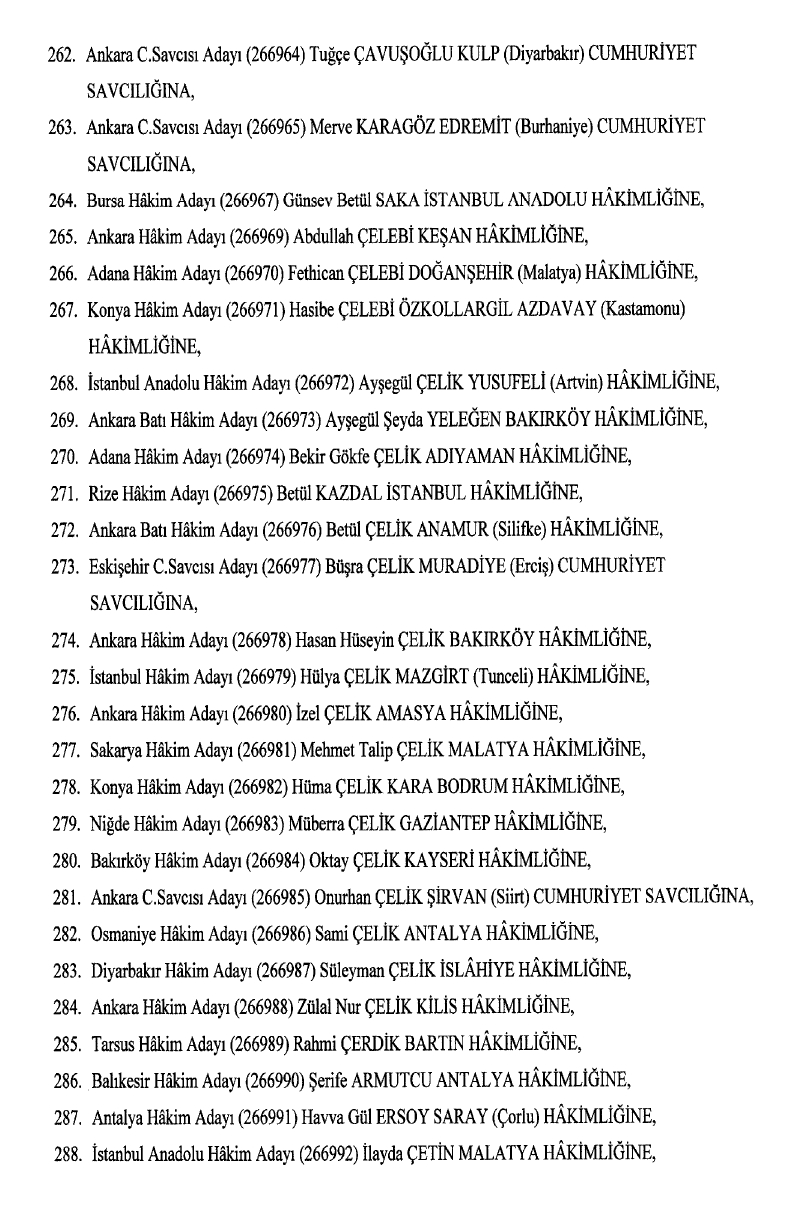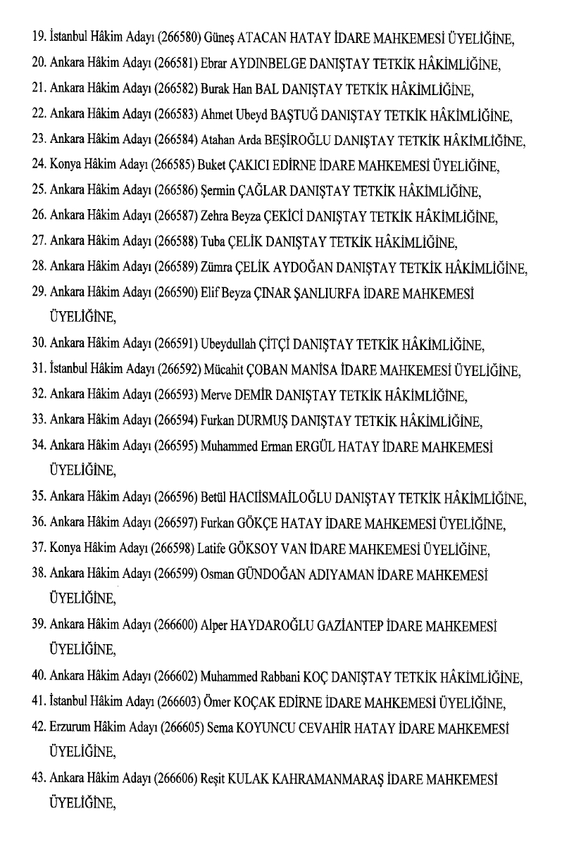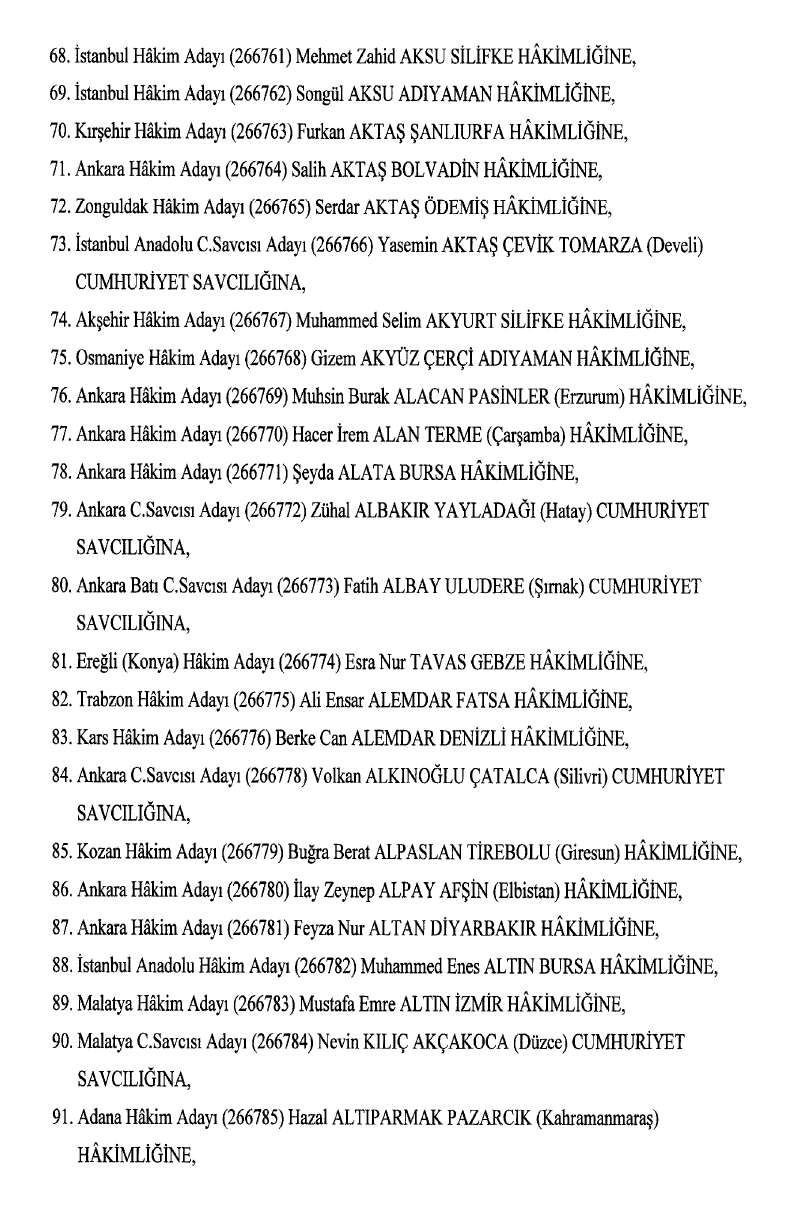 Hakimler ve Savcılar Kurulunca (HSK), 1042 adli yargı hakim ve Cumhuriyet savcısı adayı ile 60 idari yargı hakim adayının atama kararı, Resmi Gazete'de yayımlandı. Buna göre, 1042 adli yargı hakim ve Cumhuriyet savcısı adayı ile 60 idari yargı hakim adayı, 25 Temmuz'da yapılan ad çekme sonucu HSK tarafından atandı. Söz konusu atamalar, 2802 sayılı Hakimler ve Savcılar Kanunu'nun 13. maddesi gereğince gerçekleştirildi. İşte isim isim o liste...