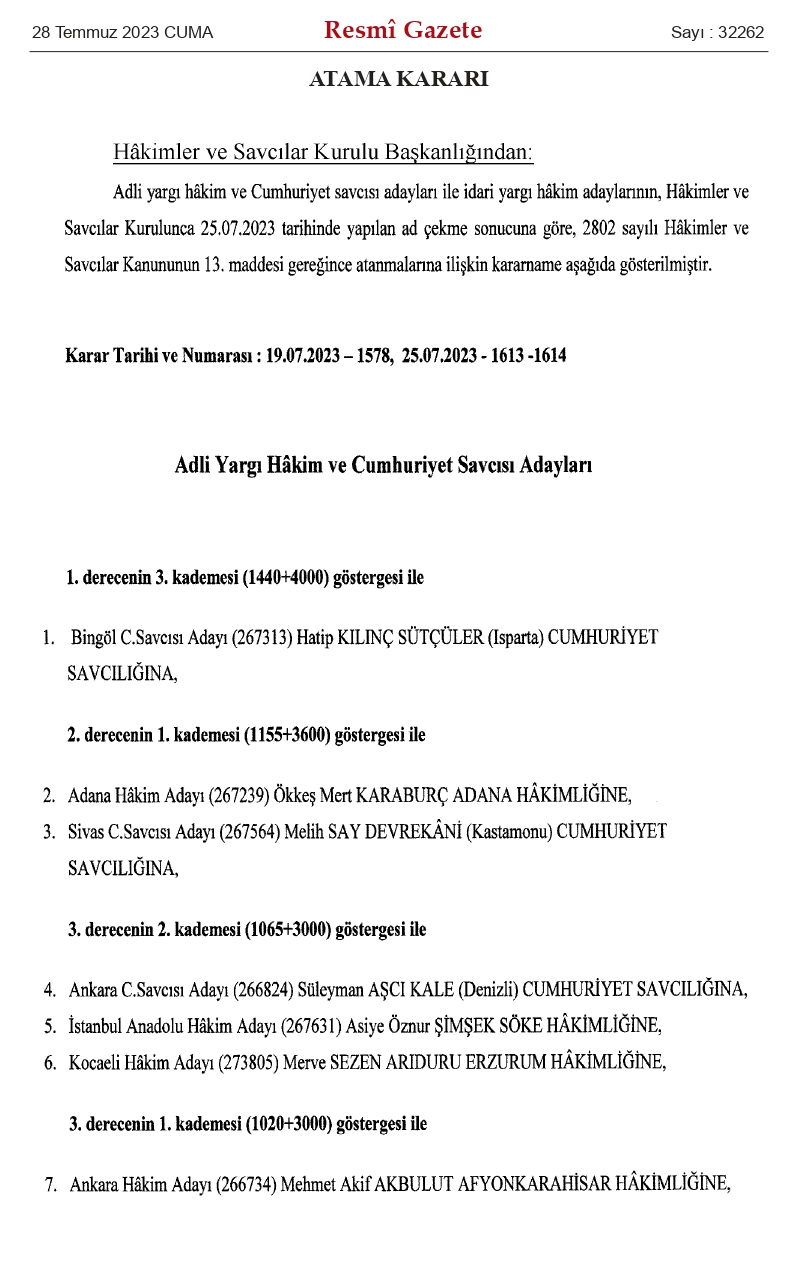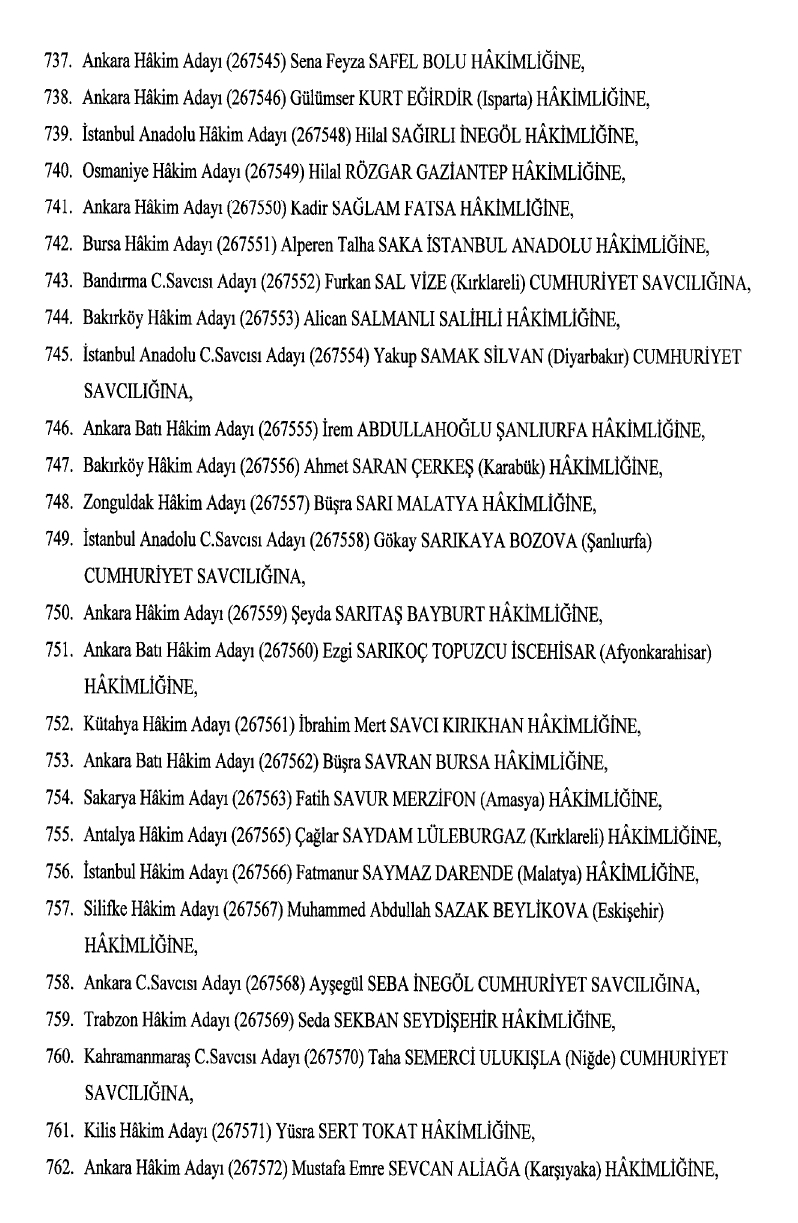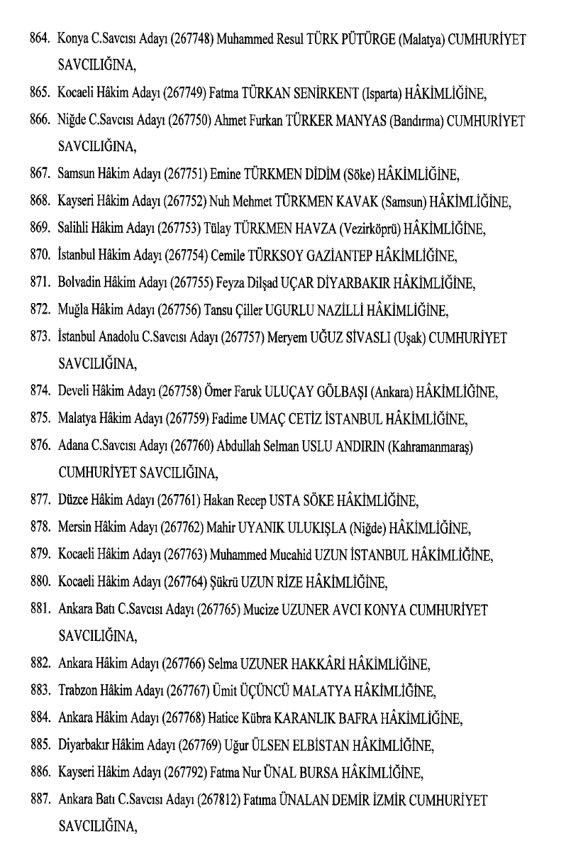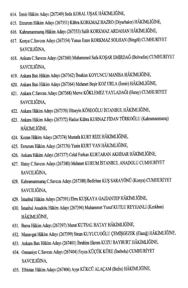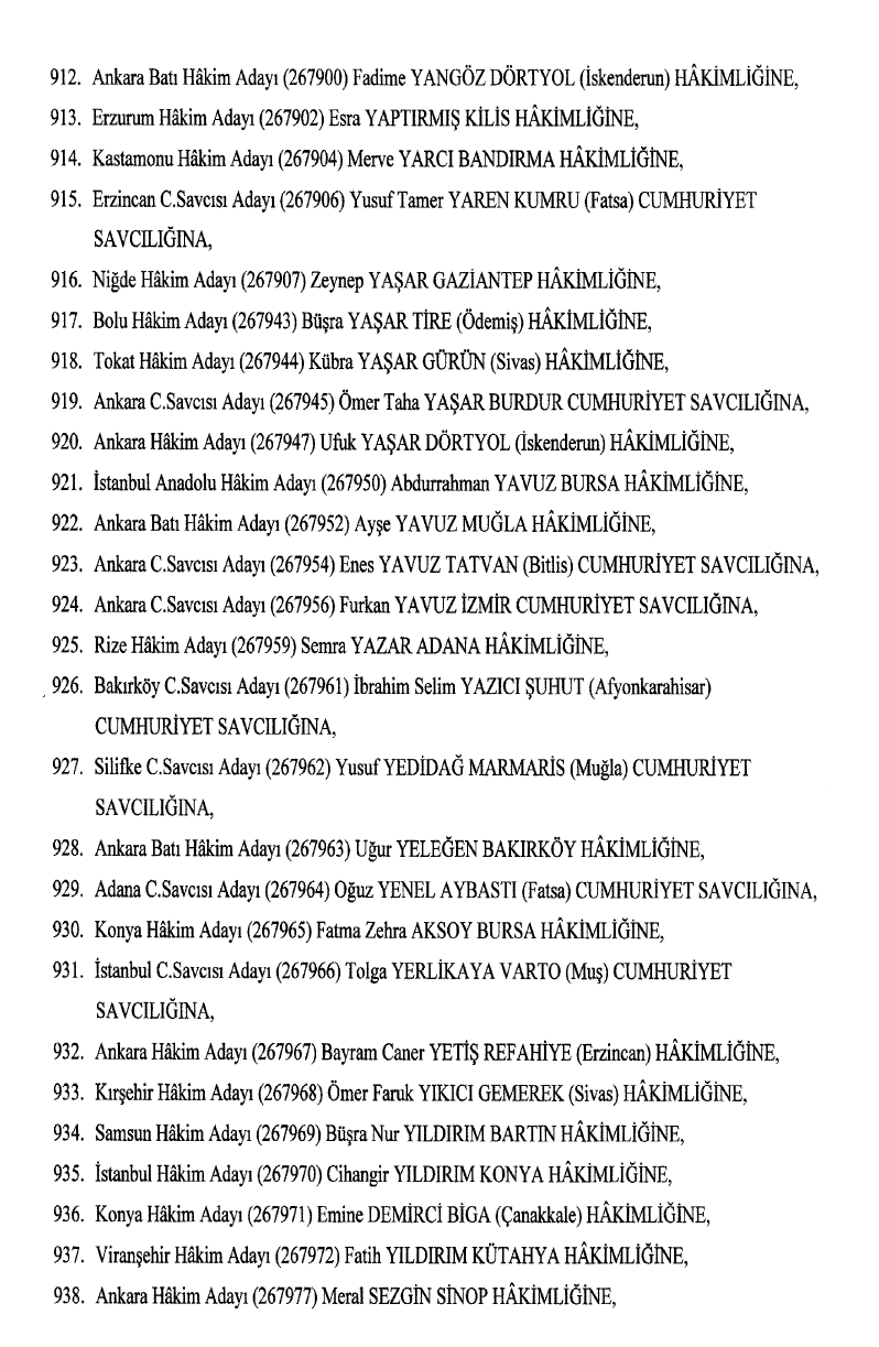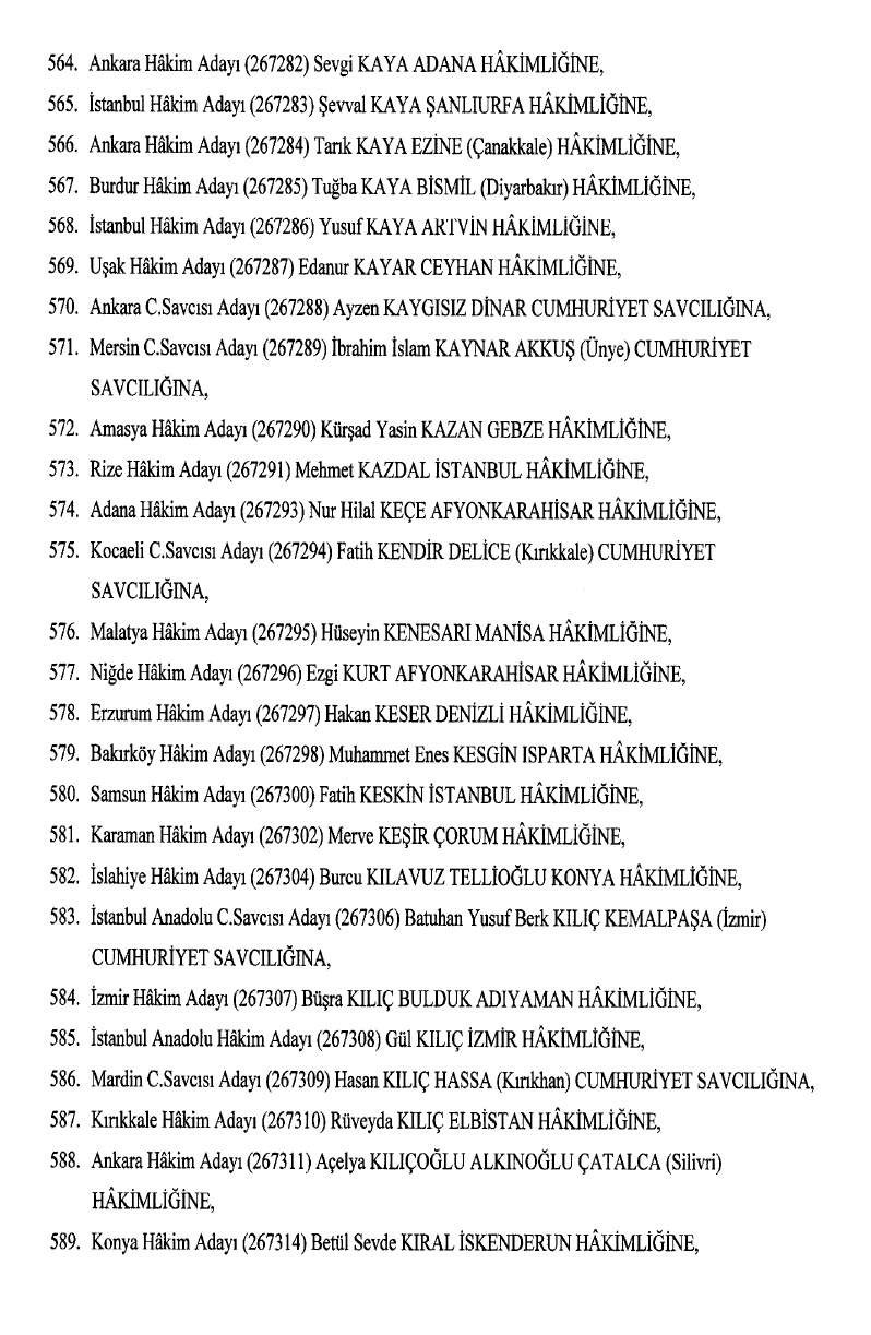 Hakimler ve Savcılar Kurulunca (HSK), 1042 adli yargı hakim ve Cumhuriyet savcısı adayı ile 60 idari yargı hakim adayının atama kararı, Resmi Gazete'de yayımlandı. Buna göre, 1042 adli yargı hakim ve Cumhuriyet savcısı adayı ile 60 idari yargı hakim adayı, 25 Temmuz'da yapılan ad çekme sonucu HSK tarafından atandı. Söz konusu atamalar, 2802 sayılı Hakimler ve Savcılar Kanunu'nun 13. maddesi gereğince gerçekleştirildi. İşte isim isim o liste...