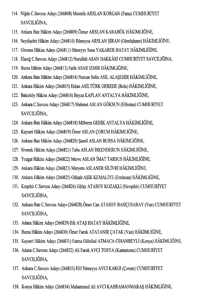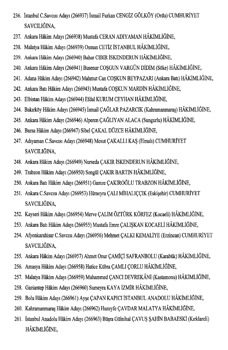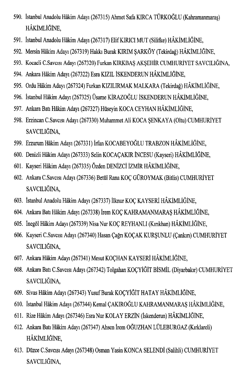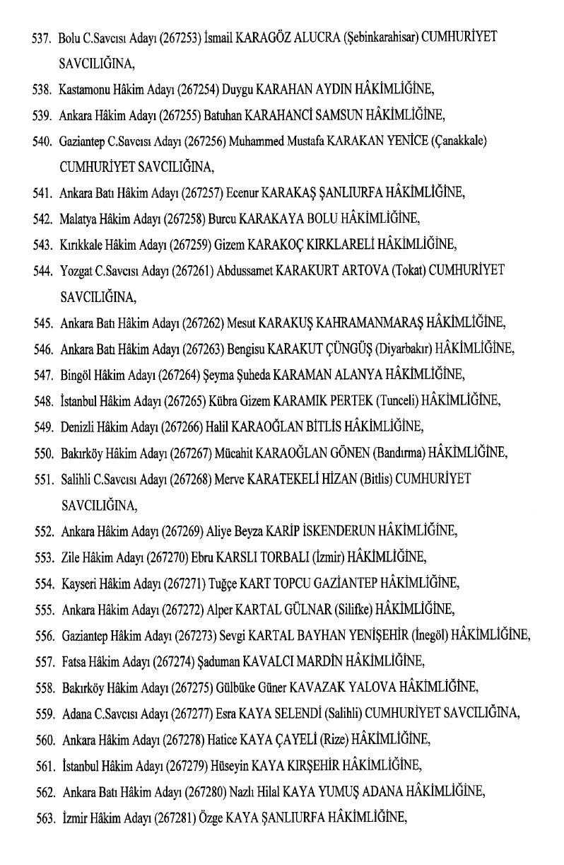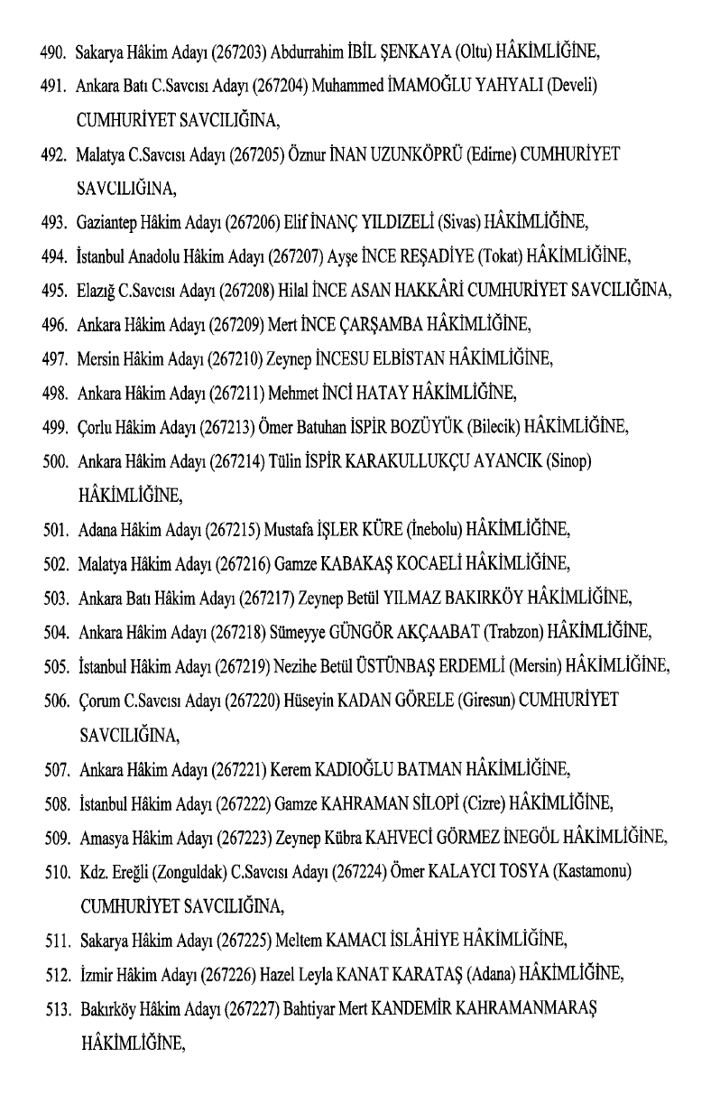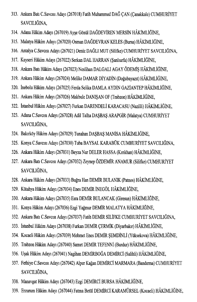 Hakimler ve Savcılar Kurulunca (HSK), 1042 adli yargı hakim ve Cumhuriyet savcısı adayı ile 60 idari yargı hakim adayının atama kararı, Resmi Gazete'de yayımlandı. Buna göre, 1042 adli yargı hakim ve Cumhuriyet savcısı adayı ile 60 idari yargı hakim adayı, 25 Temmuz'da yapılan ad çekme sonucu HSK tarafından atandı. Söz konusu atamalar, 2802 sayılı Hakimler ve Savcılar Kanunu'nun 13. maddesi gereğince gerçekleştirildi. İşte isim isim o liste...