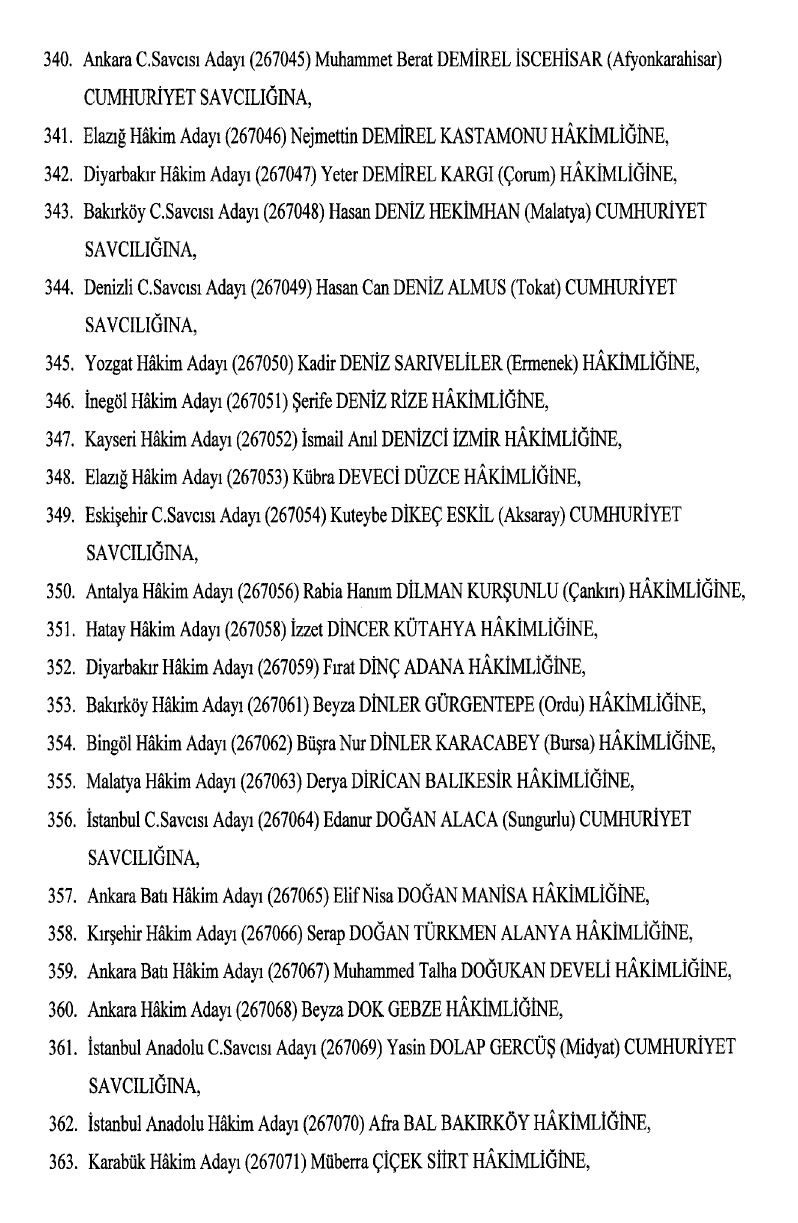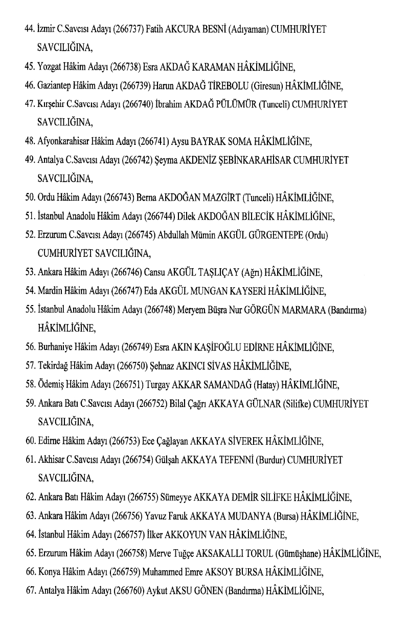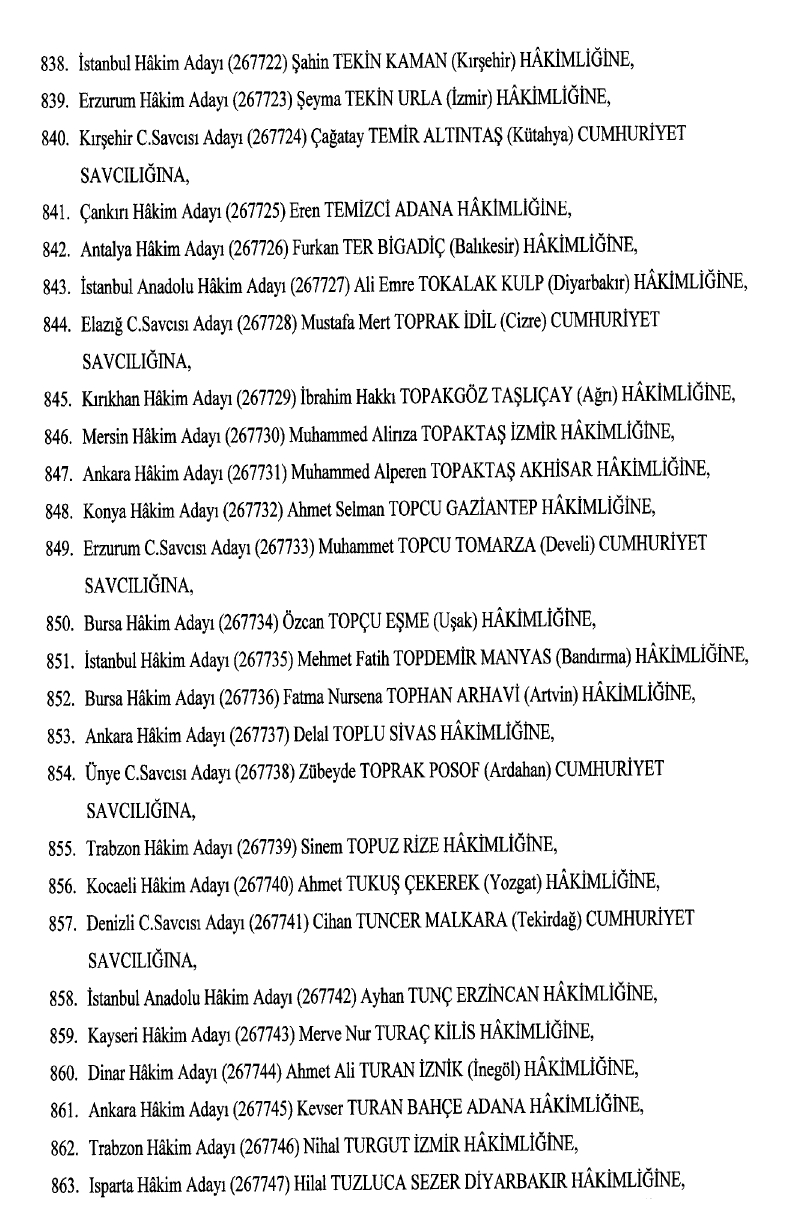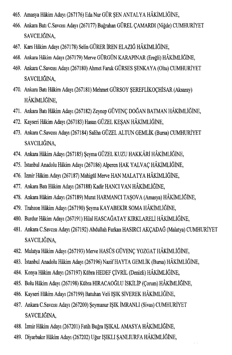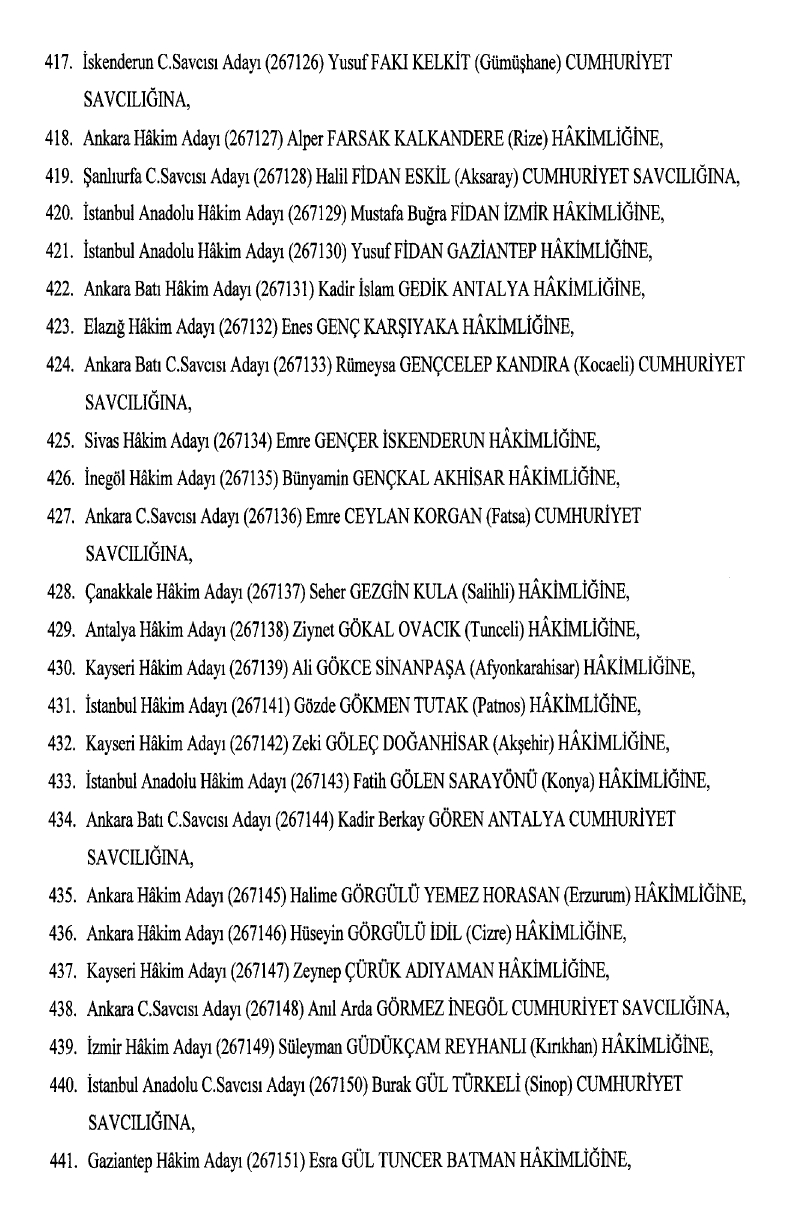 Hakimler ve Savcılar Kurulunca (HSK), 1042 adli yargı hakim ve Cumhuriyet savcısı adayı ile 60 idari yargı hakim adayının atama kararı, Resmi Gazete'de yayımlandı. Buna göre, 1042 adli yargı hakim ve Cumhuriyet savcısı adayı ile 60 idari yargı hakim adayı, 25 Temmuz'da yapılan ad çekme sonucu HSK tarafından atandı. Söz konusu atamalar, 2802 sayılı Hakimler ve Savcılar Kanunu'nun 13. maddesi gereğince gerçekleştirildi. İşte isim isim o liste...
