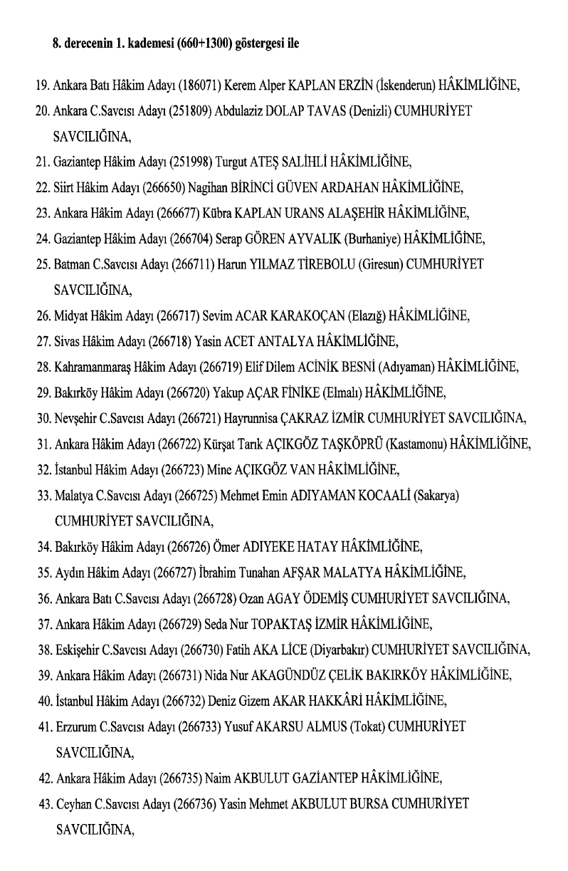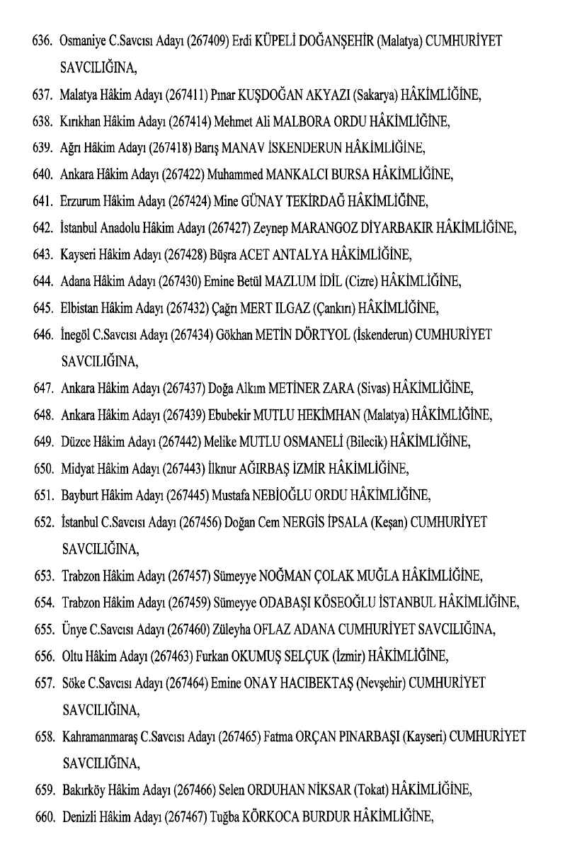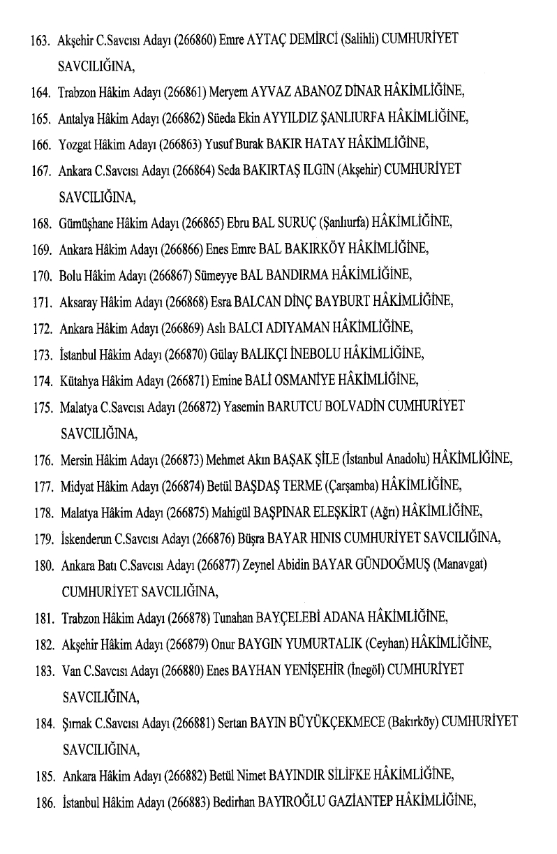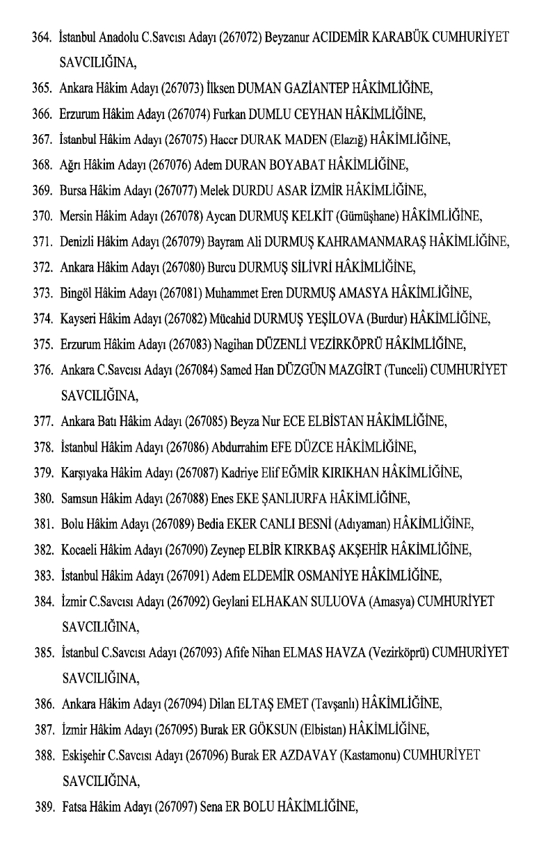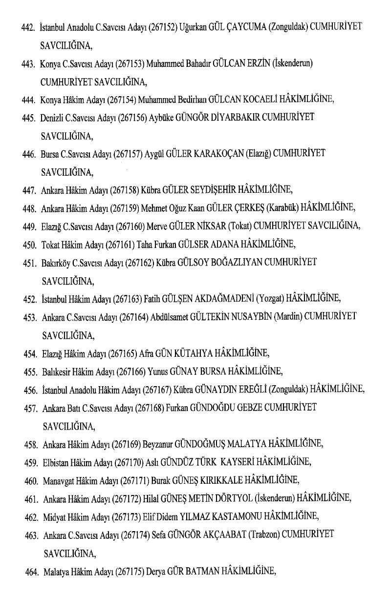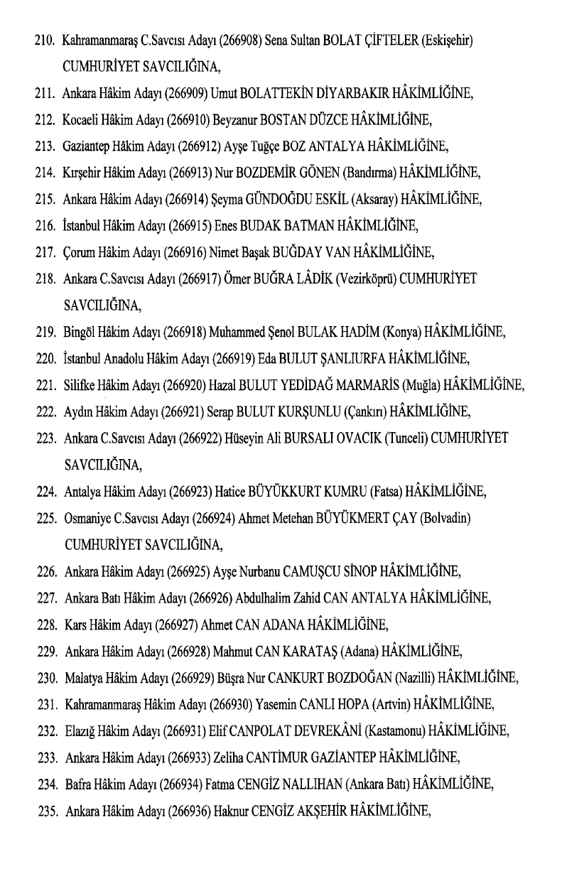 Hakimler ve Savcılar Kurulunca (HSK), 1042 adli yargı hakim ve Cumhuriyet savcısı adayı ile 60 idari yargı hakim adayının atama kararı, Resmi Gazete'de yayımlandı. Buna göre, 1042 adli yargı hakim ve Cumhuriyet savcısı adayı ile 60 idari yargı hakim adayı, 25 Temmuz'da yapılan ad çekme sonucu HSK tarafından atandı. Söz konusu atamalar, 2802 sayılı Hakimler ve Savcılar Kanunu'nun 13. maddesi gereğince gerçekleştirildi. İşte isim isim o liste...