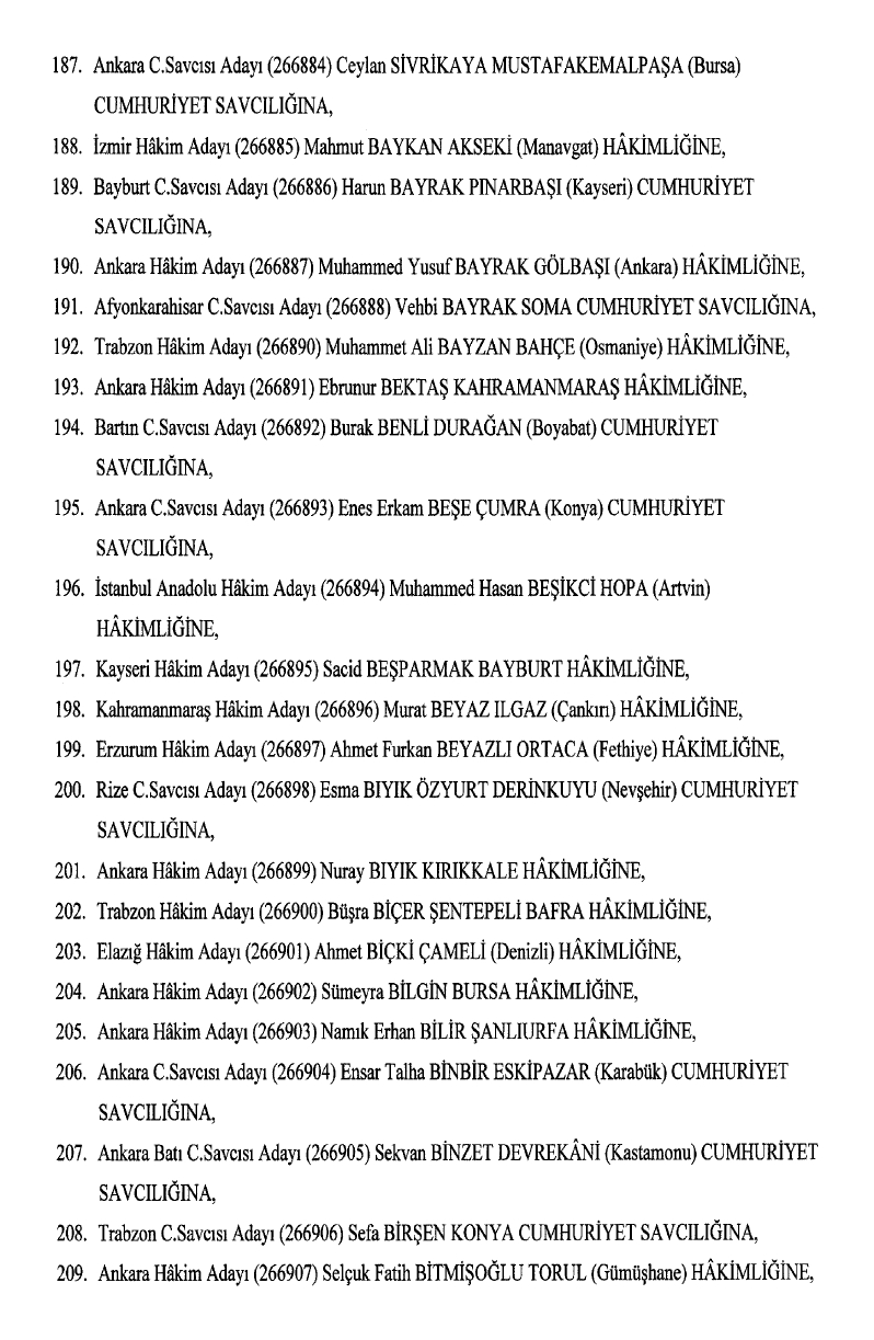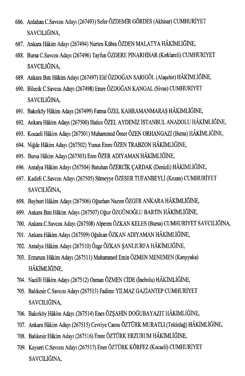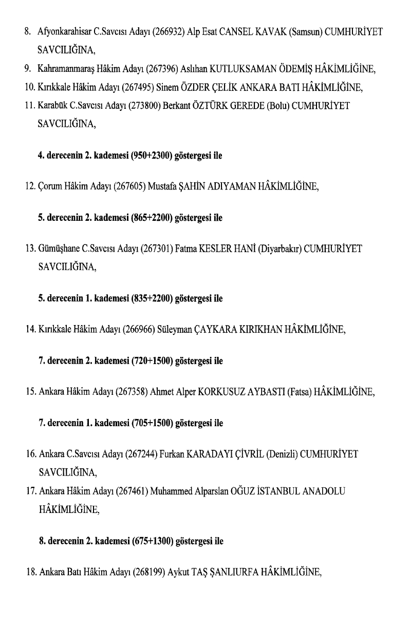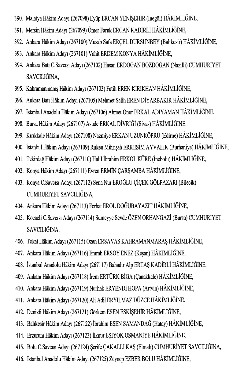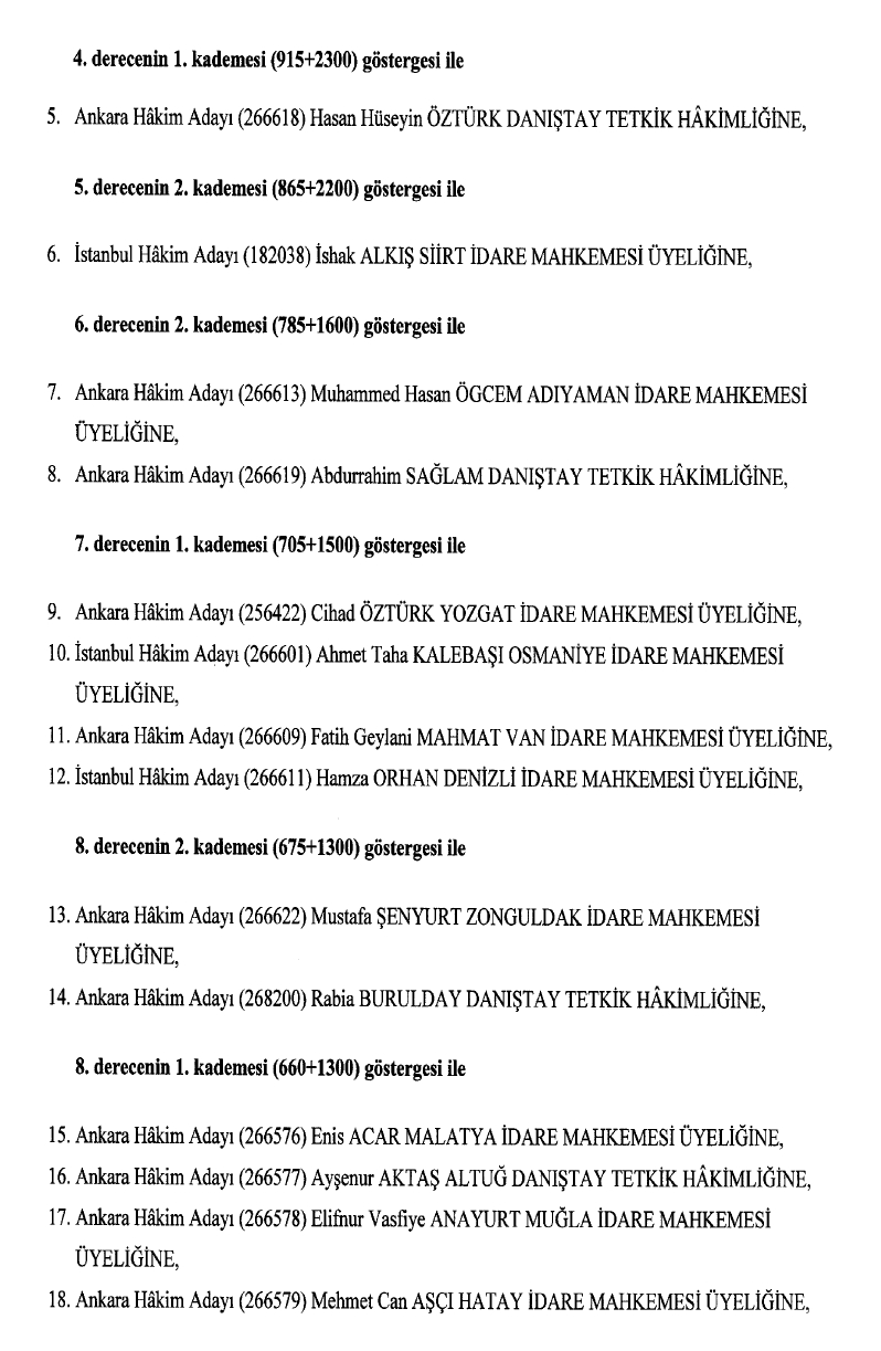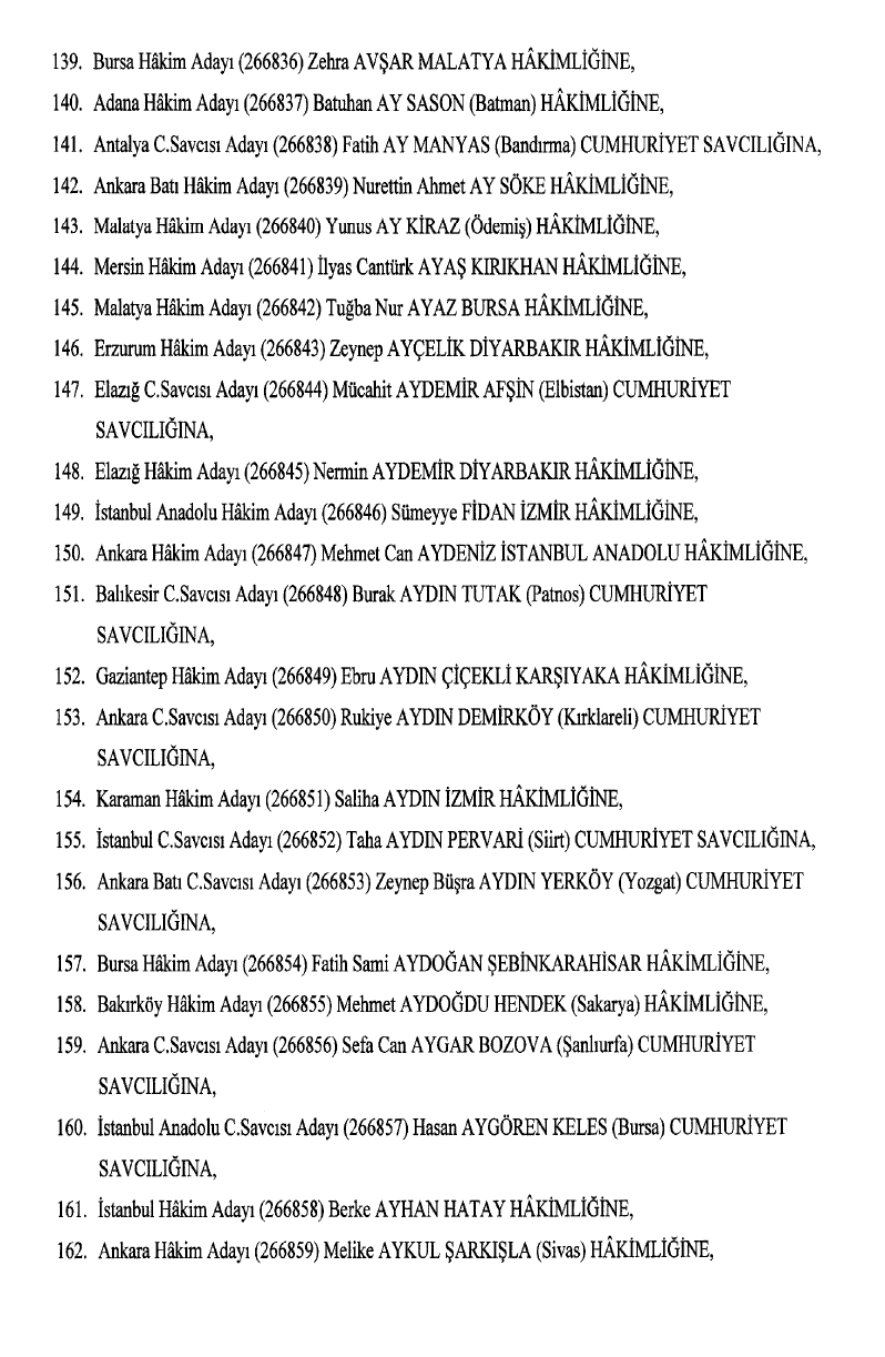 Hakimler ve Savcılar Kurulunca (HSK), 1042 adli yargı hakim ve Cumhuriyet savcısı adayı ile 60 idari yargı hakim adayının atama kararı, Resmi Gazete'de yayımlandı. Buna göre, 1042 adli yargı hakim ve Cumhuriyet savcısı adayı ile 60 idari yargı hakim adayı, 25 Temmuz'da yapılan ad çekme sonucu HSK tarafından atandı. Söz konusu atamalar, 2802 sayılı Hakimler ve Savcılar Kanunu'nun 13. maddesi gereğince gerçekleştirildi. İşte isim isim o liste...