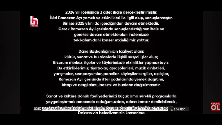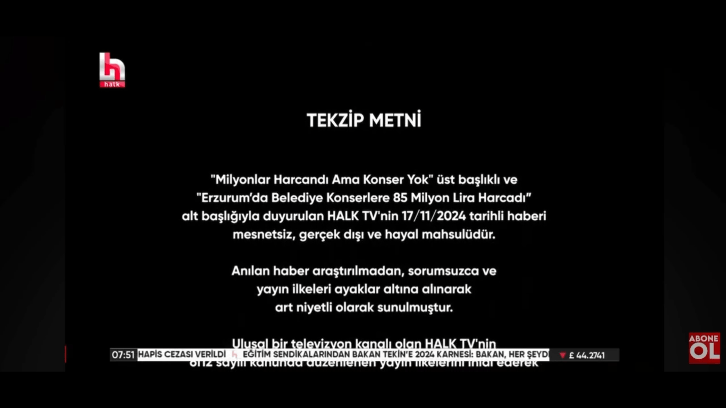 Halk TV, Erzurum Büyükşehir Belediye'sinin konserlere 85 milyon harcadığını öne sürdü. Erzurum Büyükşehir Belediyesi, haberin yalan olduğunu belirterek mahkemeye başvurdu. Mahkeme, Halk TV'nin haberinin yalan olduğunu tescilledi. Halk TV, haberin yalan olduğunu yayınladığı tekzip ile duyurdu.