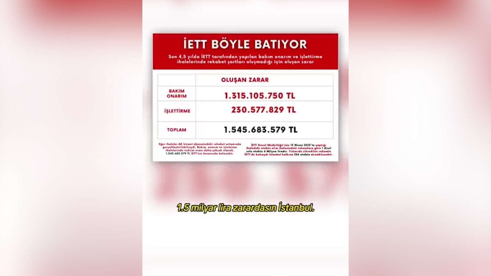 CHP'li İBB belediyesi yönetiminde çöken toplu ulaşım sistemi vatandaşı isyan ettirirken, adrese teslim ihaleler İstanbul'u batırdı. AK Parti İBB Grup Sözcüsü Murat Türkyılmaz, yayınladığı videoda, CHP'li İBB yönetiminin İETT'deki skandallarını tek tek anlattı. İBB'nin 5 yılda otobüslerin bakımı için 7 milyarlık ihale gerçekleştirdiğini ve bunun 5 milyarlık kısmının CHP'li Özgür Karabat'ın mali müşavirliğini yaptığı firmaya verildiğini belirten Türkyılmaz, aylık 100 milyon liralık zararın ortaya çıktığını ifade etti.
