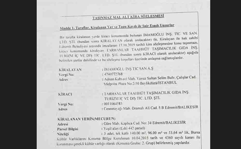 Balıkesir'in Edremit ilçesine bağlı Güre mahallesinde bulunan 350 yıllık tarihi bina üzerinden nasıl rant vurgunu yapıldığını SABAH ortaya çıkardı. Yaklaşık 350 yıllık tarihi zeytinyağı fabrika binasını sergi ve söyleşi gibi kültürel etkinliklerde kullanmak için Vakıflar Genel Müdürlüğünden kiralayan CHP'Lİ Edremit Belediyesi, daha sonra 2019 yılında tarihi binayı İmamoğlu İnşaat ve Sanayi Şirketi adına Ekrem İmamoğlu'nun babası Hasan İmamoğlu'na 250 TL karşılığında kiraladı.