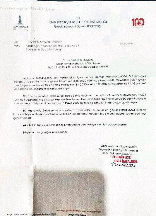 CHP'li Tekirdağ Büyükşehir Belediyesi'nin, otelde konuk ettiği depremzedeleri seçim sonrası kapı dışarı etmesinin ardından bir skandal da İzmir'de yaşandı. İzmir Büyükşehir Belediyesi 30 Ekim 2020'de yaşanan İzmir depremimde evleri yıkıldığı için mülkiyeti kendisine ait konutlarda misafir ettiği Uzundere'deki depremzedelere, evleri 31 Mayıs 2023'e kadar boşaltmaları için tebligat gönderdi.