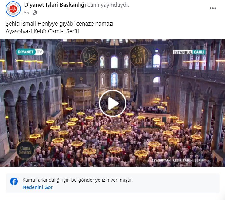 Diyanet İşleri Başkanlığı Basın Müşaviri Burak Orhan yaptığı paylaşımda META'yı eleştirdi. Orhan paylaşımında, "Sözde özgürlükçü sosyal medya platformu Facebook Şehid İsmail Heniyye için İstanbul'da Ayasofya-i Kebir Camisinde Diyanet İşleri Başkanımız Prof. Dr. Ali Erbaş tarafından kıldırılan gıyabi cenaze namazından bile rahatsız oldu. Diyanet İşleri Başkanlığımızın gıyabi cenaze namazı videosunu kaldırdı. Üstüne de sosyal medya hesabımıza 1 ay canlı yayın yasağı getirdi" ifadelerini kullandı.