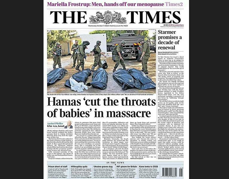 10 Ekim'de The Times, "Bebeklerin boğazları kesildi: Kfar Aza kibutz katliamı nasıl gelişti?