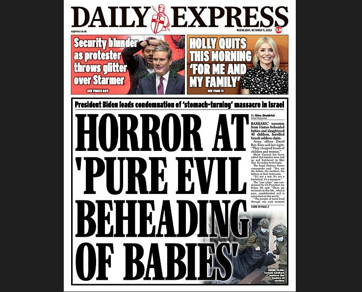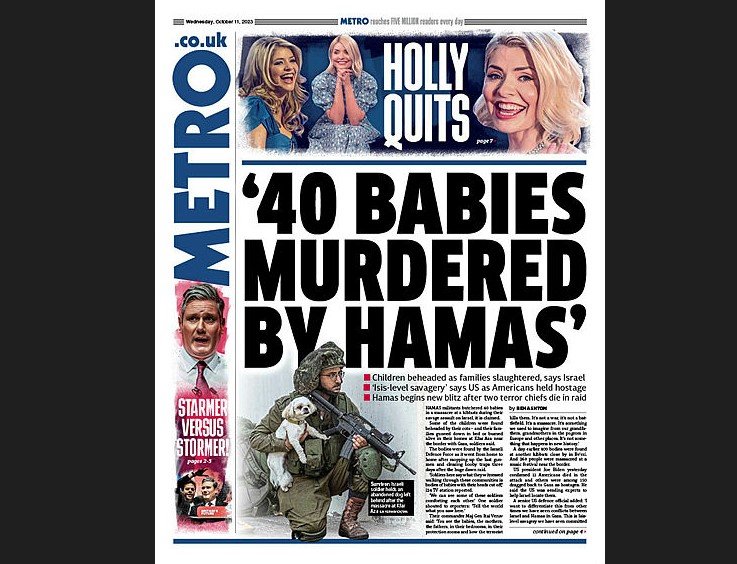 İşgalci İsrail hükümetine yakın İ24News televizyonu, 10 Ekim'de 15.19'da "40 İsrailli bebek Hamas tarafından kafaları kesilerek öldürüldü" yalanını servis etti.