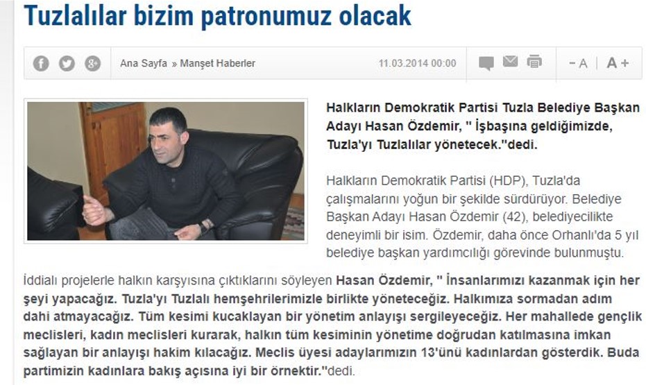 2014 ve 2019 yerel seçimlerinde HDP Tuzla Belediye Başkan adayı olan ve 31 Mart 2024 yerel seçiminde DEM Parti Tuzla Belediye Başkanı adayı olarak sahada çalışan Hasan Özdemir, CHP Tuzla Belediye Meclis 3. sırada yer aldı.