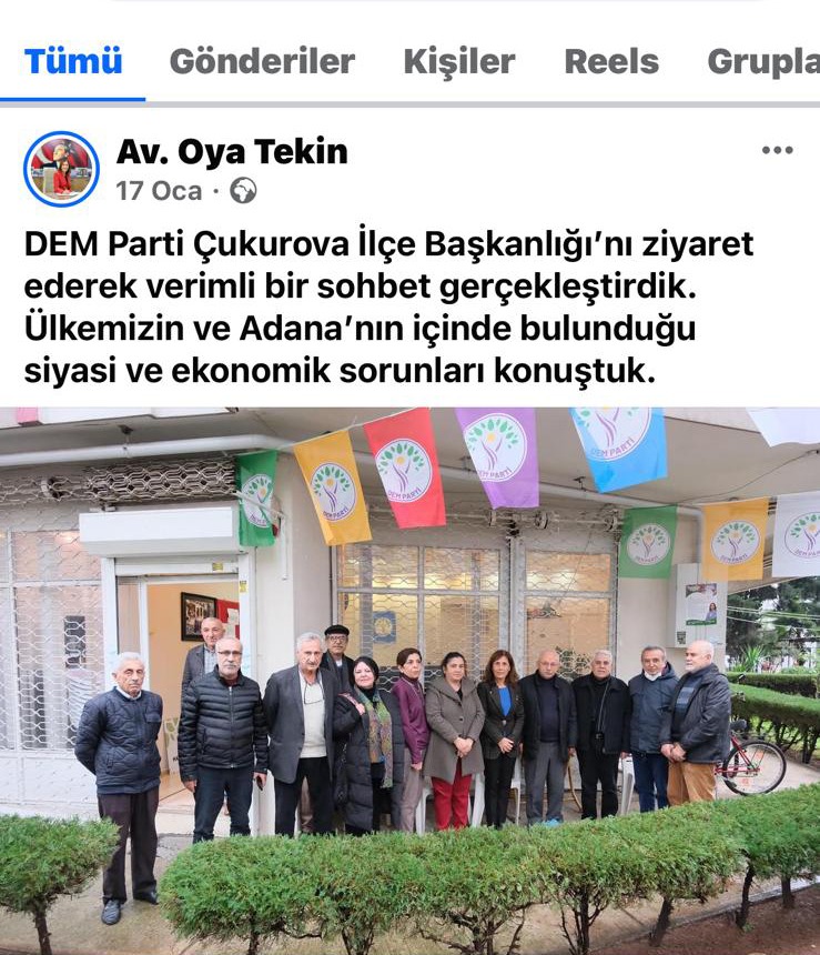 Aynı zamanda avukat olan Oya Tekin 17 Ocak'ta DEM'in Çukurova İlçe Başkanlığı'nı ziyaret etti. Seçim boyunca DEM ile ittifak yapmadıklarını kabul etmeyen CHP yönetiminin yalanı fotoğrafla gün yüzüne çıktı..