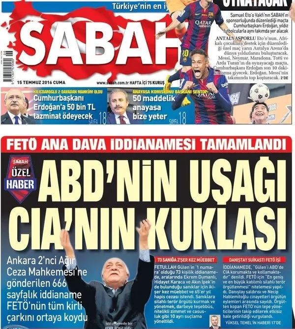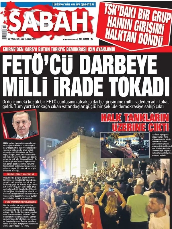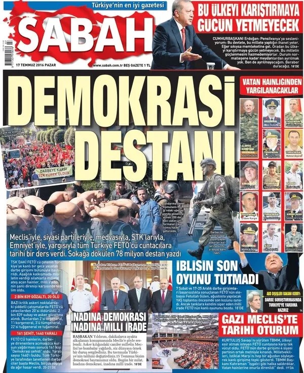 SABAH, Fetullahçı Terör Örgütü'nün (FETÖ) yıllar boyunca ortaya koyduğu kumpaslarına karşı tavizsiz bir direniş gösterdi. 39 yıldır toplumun sesi olan SABAH, FETÖ'cü darbe girişiminde de üzerine düşen görevi yerine getirdi.