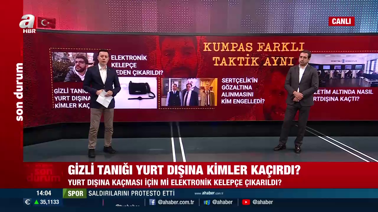 Türkiye, Ayhan Bora Kaplan suç örgütü üzerinden aralarında siyasiler, gazeteciler, ekonomi dünyasından ünlü isimlerin de yer aldığı birçok isme yönelik kumpas planıyla çalkalanıyor. Firari gizli tanıkla yapılan görüşme kayıtlarının ifşa olmasının ardından 3 emniyet müdürü, 2 komiser ve 3 sivil şahıs gözaltına alındı. Peki gizli tanık Serdar Sertçelik yurt dışına nasıl kaçtı? Kimle irtibatlı? SABAH Gazetesi Haber Müdürü Nazif Karaman ve SABAH Gazetesi Haber Koordinatörü Abdurrahman Şimşek, yeni detayları ilk kez A Haber canlı yayınında açıkladı.