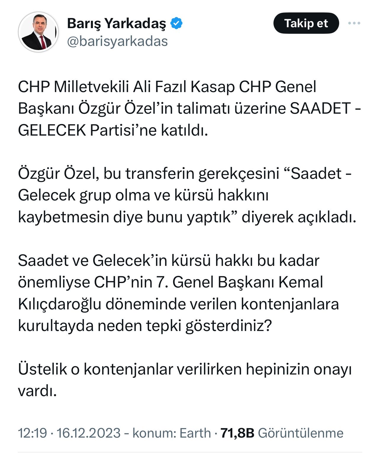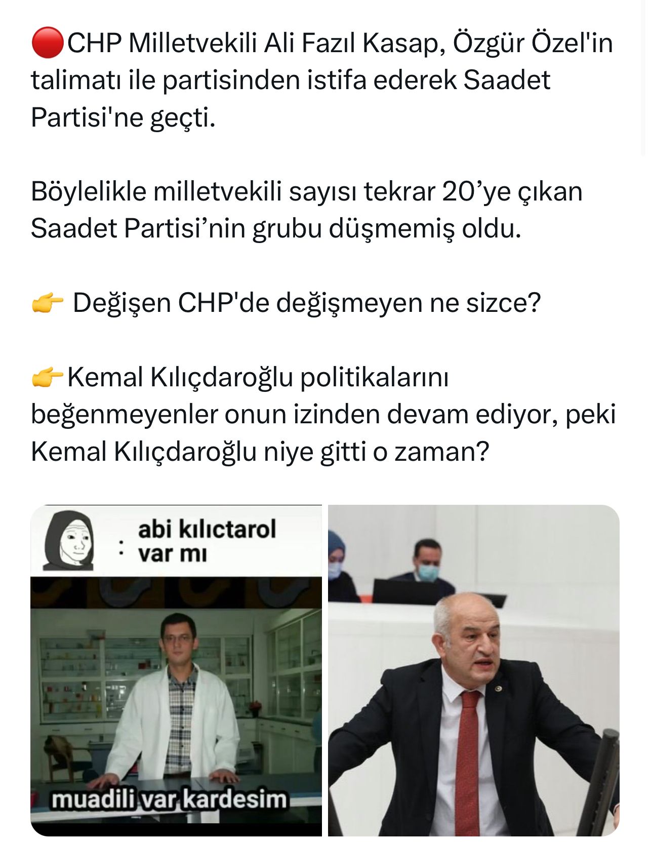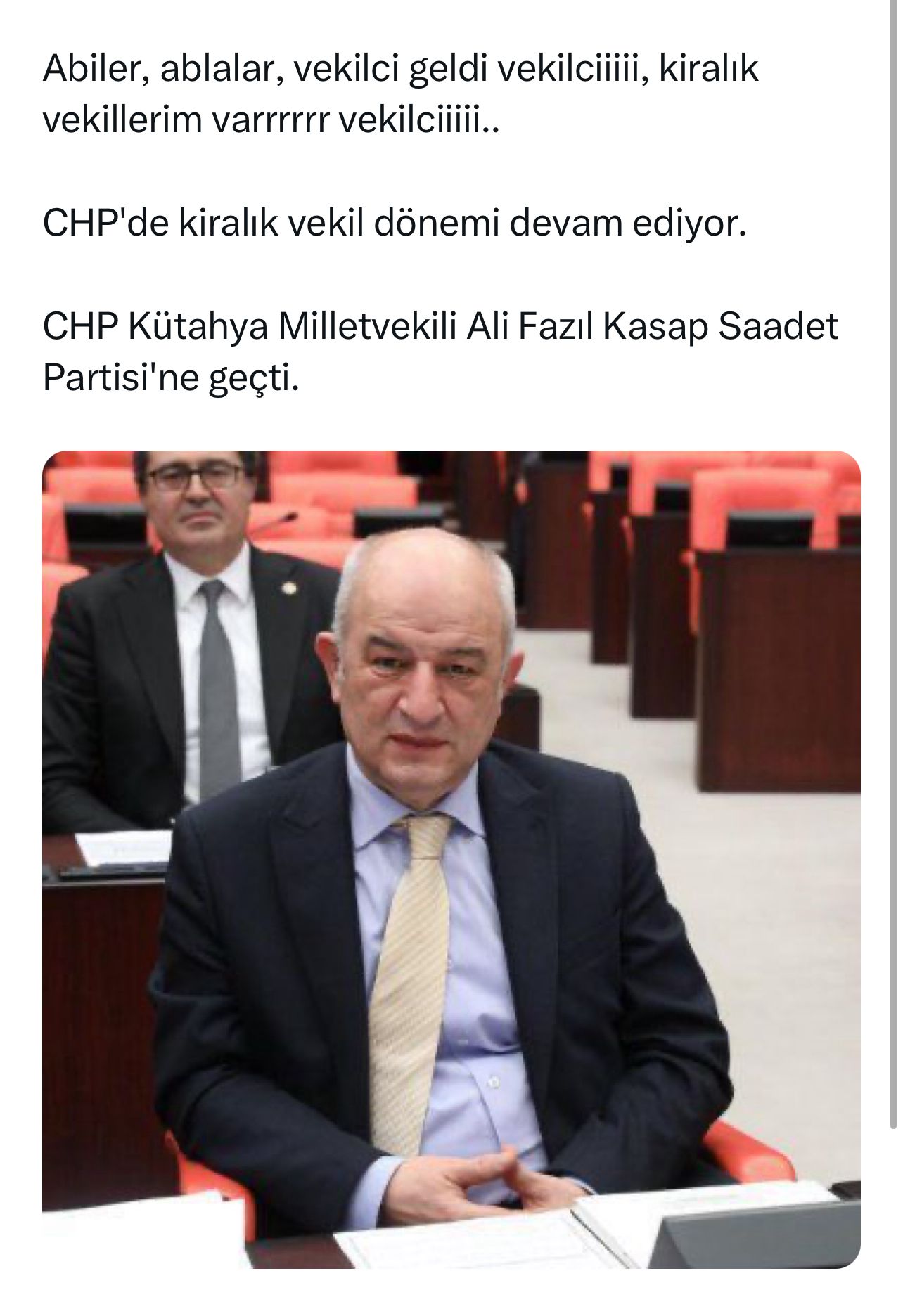 Türkiye Büyük Millet Meclisi'nde 20 milletvekiliyle temsil edilen Saadet-Gelecek grubu, Saadet Partisi Milletvekili Hasan Bitmez'in vefatıyla düşmüştü. CHP Kütahya Milletvekili Ali Fazıl Kasap Saadet Partisi'ne geçti. Transferin perde arkasına SABAH ulaştı. Saadet Partisi grubun dağılmasını önlemek için önce Demokrat Parti'ye başvurdu. Gültekin Uysal onay vermeyince rota CHP'ye çevrildi. CHP Genel Başkanı'nı arayan Temel Karamollaoğlu, bir milletvekili istedi. Bunun üzerine Özel, CHP'den seçime giren vekil Ali Fazıl Kasap'ı Saadet Partisine gönderdi. Kasap, "Vicdani zorunluluk gereği geçmek durumunda kaldım" derken CHP'liler ise "Kiralık vekil dönemi bitmedi" diyerek partilerine tepki gösterdi.